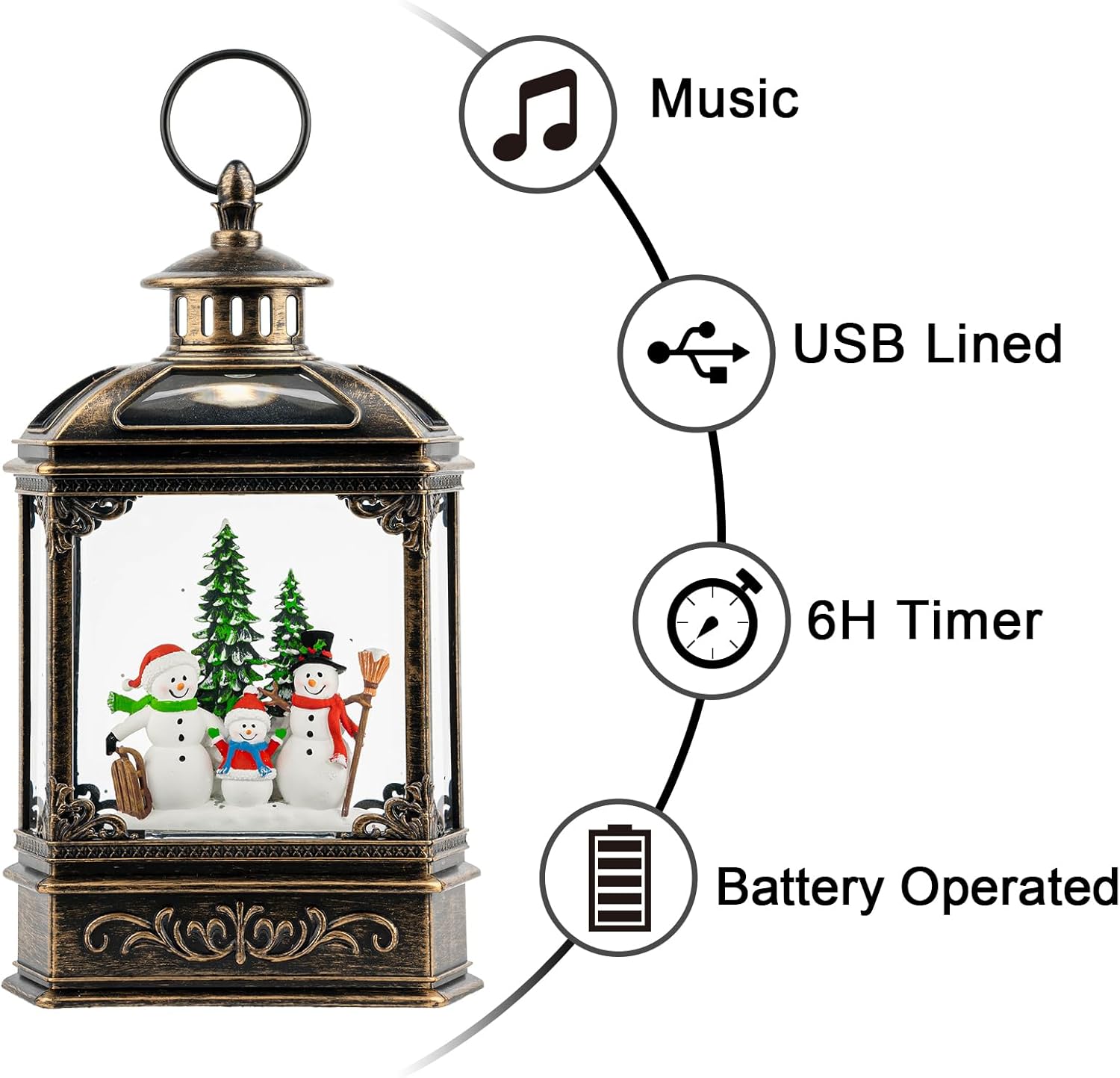 Christmas Snow Globe Lantern Water Glittering Snowman Family with Music & Timer, USB Lined/Battery Operated Lighted Lantern for Christmas Festival Decoration Gifts