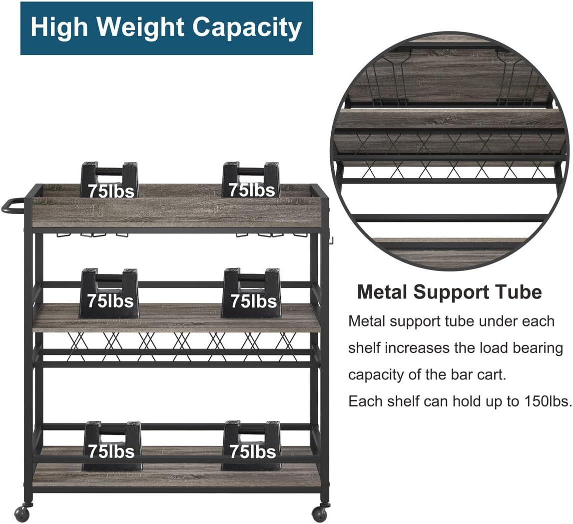 BON AUGURE Bar Cart, Home Bar Serving Cart on Wheels, Mobile 3 Tier Liquor Beverage Carts with Wine Rack and Glass Holder (Grey Oak)