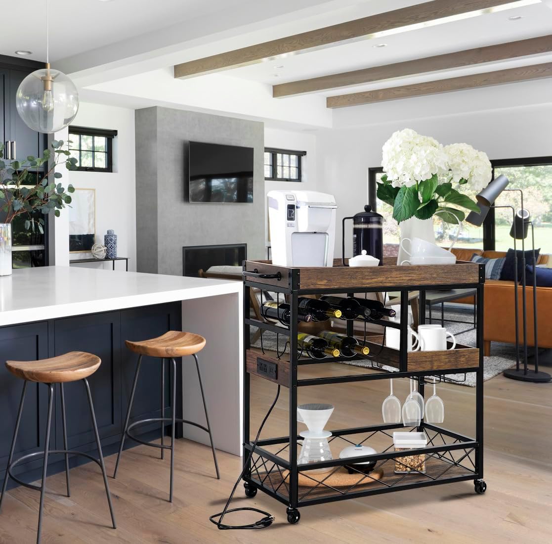 - Power Outlets: The industrial bar cart features power outlet of 110V/12A outlet and 5V/2A USB interface offering safe charging; the serving cart has a 59 inches electric cord, no need to move your coffee makers, toaster or microwave to get charged;