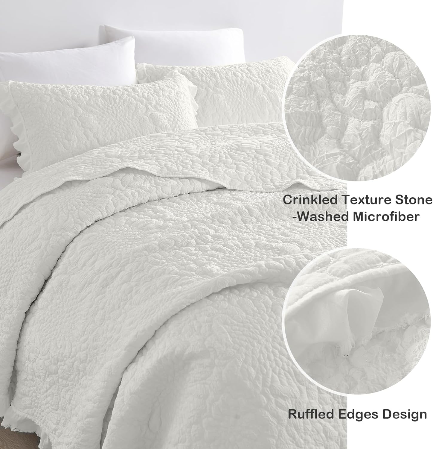 HORIMOTE HOME Cream White Ruffled Quilt King Size, Stone-Washed Microfiber Lightweight Crinkled Farmhouse Shabby Chic Bedding Set, 3 Pieces Reversible Bedspread with Pillow Shams for All Season