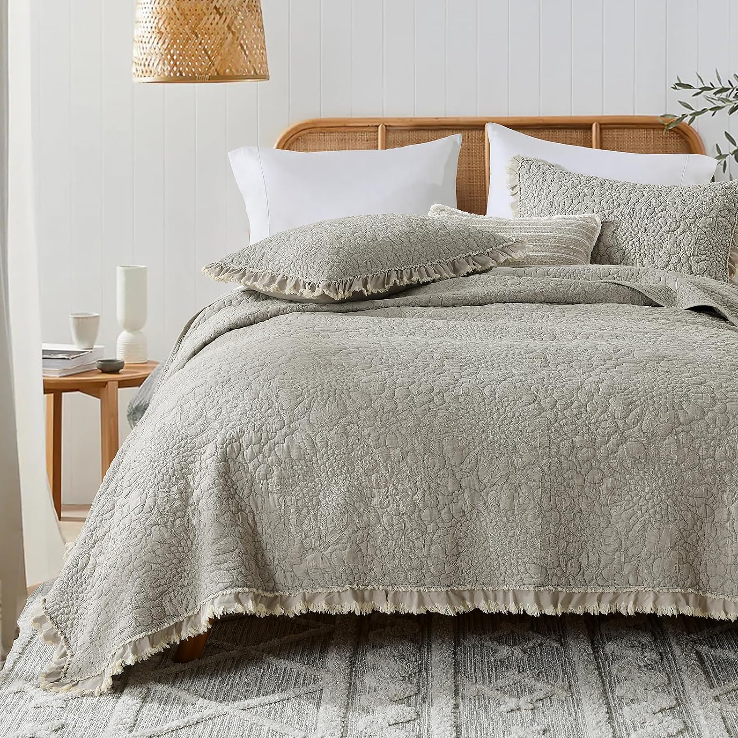 HORIMOTE HOME Beige Ruffled Quilt Queen Size, Stone-Washed Microfiber Lightweight Crinkled Farmhouse Rustic Shabby Chic Bedding Set, 3 Pieces Reversible Bedspread with Pillow Shams for All Season