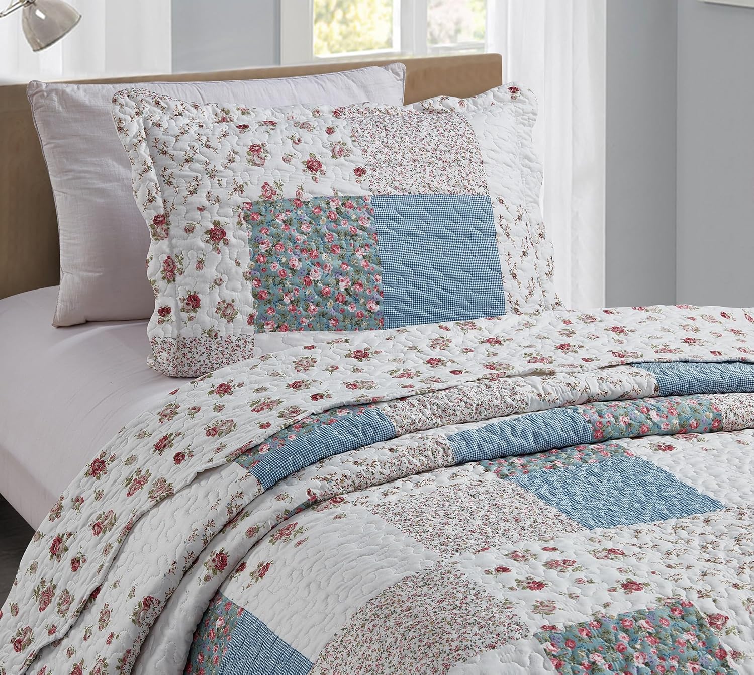 Brilliant Sunshine Pink Rose with Small Blue Check Patchwork, 2-Piece Quilt Set with 1 Sham, Reversible Bedspread, Soft Lightweight Coverlet, All-Season, Twin, Pink Blue