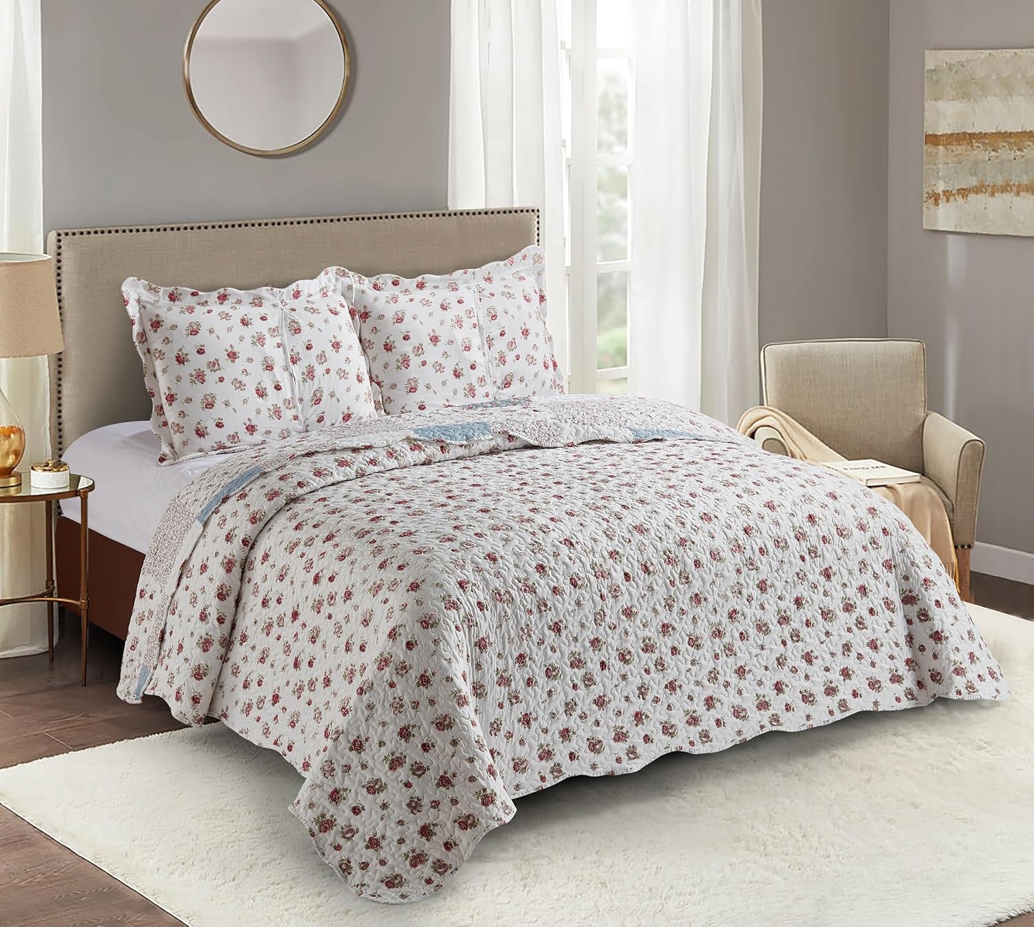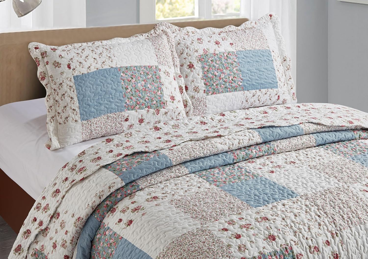 - UNIQUE DESIGN: Pink rose with small blue check patchwork patterns, with vermicelli quilting, gentle, quiet and unique. Reverse to a coordinating rose pattern. Made to enhance decor.