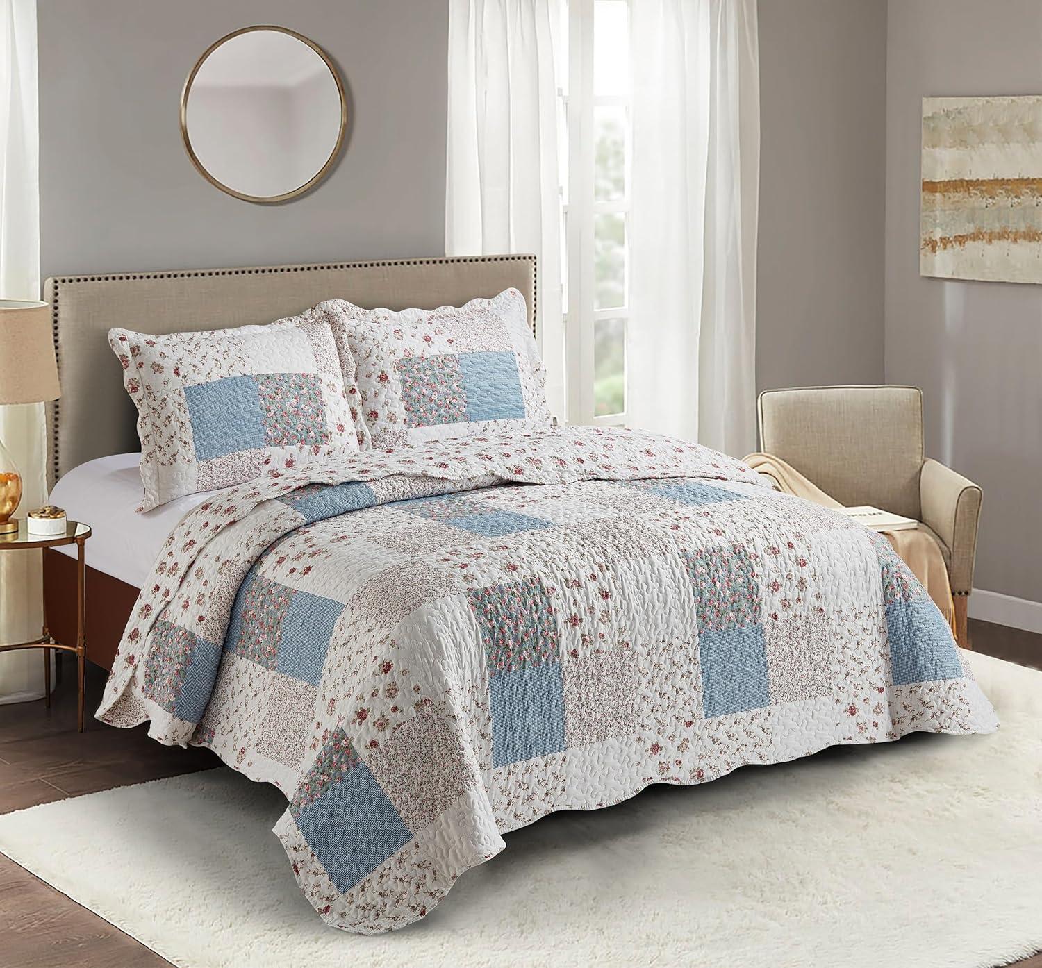 - FULL/QUEEN SIZE SET: 1 full/queen quilt 90" x 90" and 2 standard pillow shams 20" x 26".