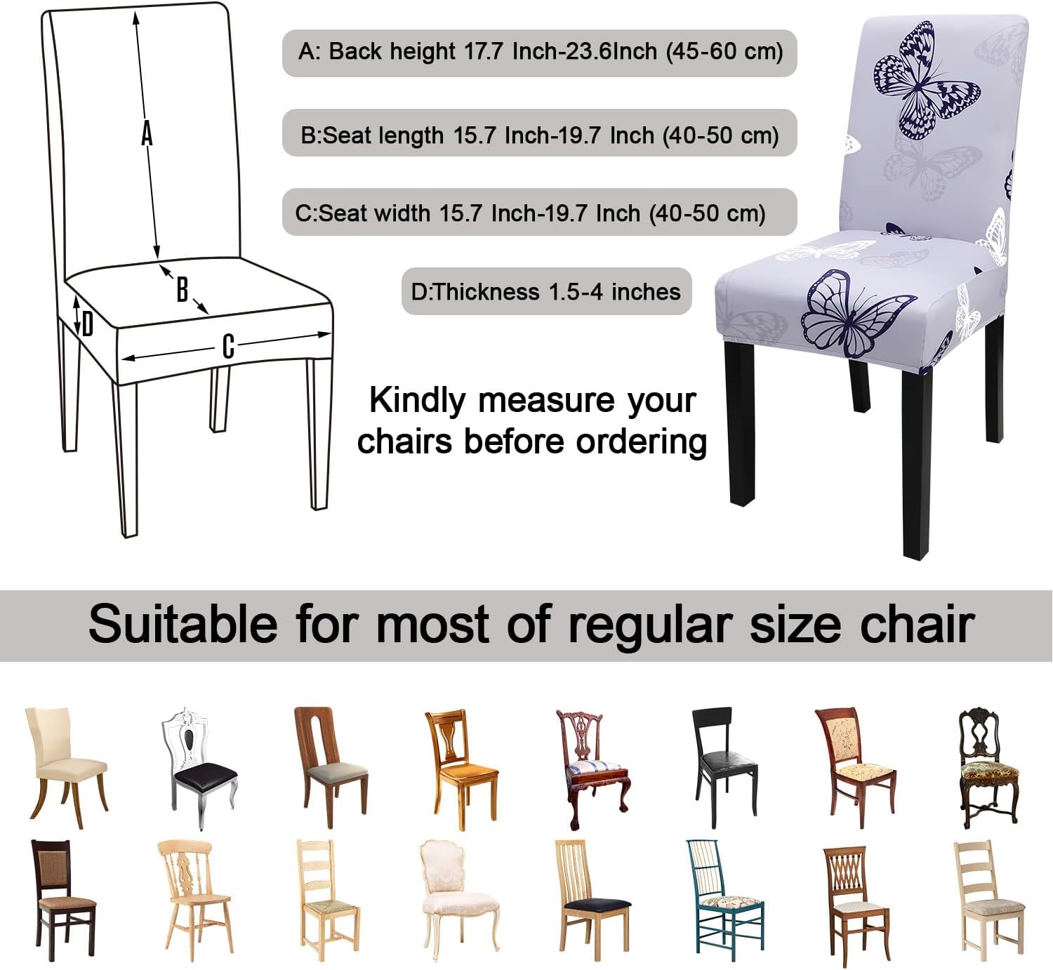 - 【Suitable for Chair Size】- Chair back height 17.7 Inch-23.6Inch (45-60 cm), chair-back width 15.7 Inch-19.7 Inch (40-50 cm),Inch Chair seat length and width 15.7 Inch-19.7 Inch (40-50 cm).Thickness 1.5-4.5Inch (4-12 cm). Please check the measurement guide in the item picture before order..(Please allow 0.5-1 inch error due to manual measurement.)