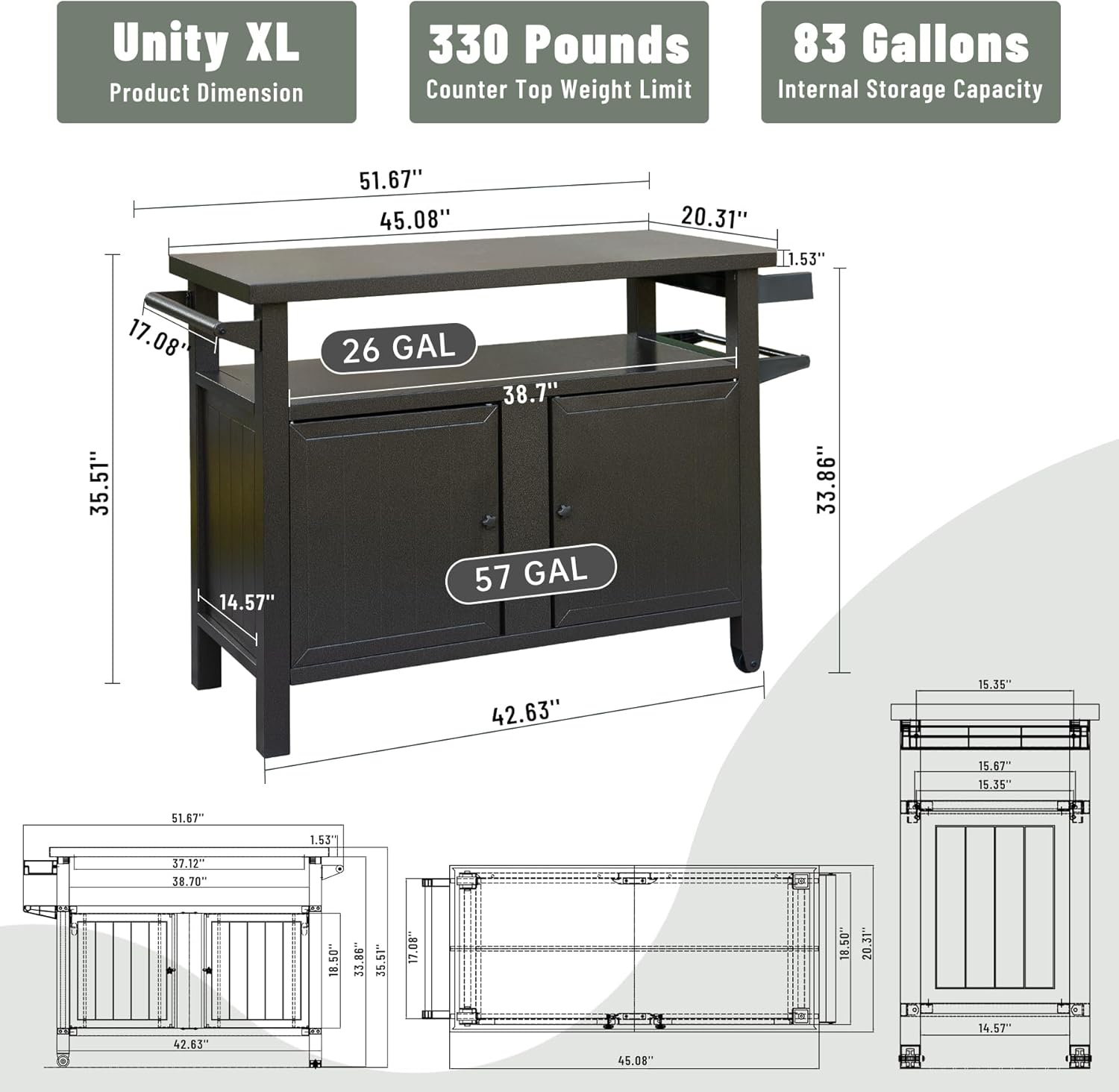 - Ample Storage Spaces- The outdoor dining cart contains 2-tier shelf for more storage. Domi outdoor grill table includes 57 gallons of interior storage & 26 gallons of open storage for a total of 83 gallons of storage capacity.