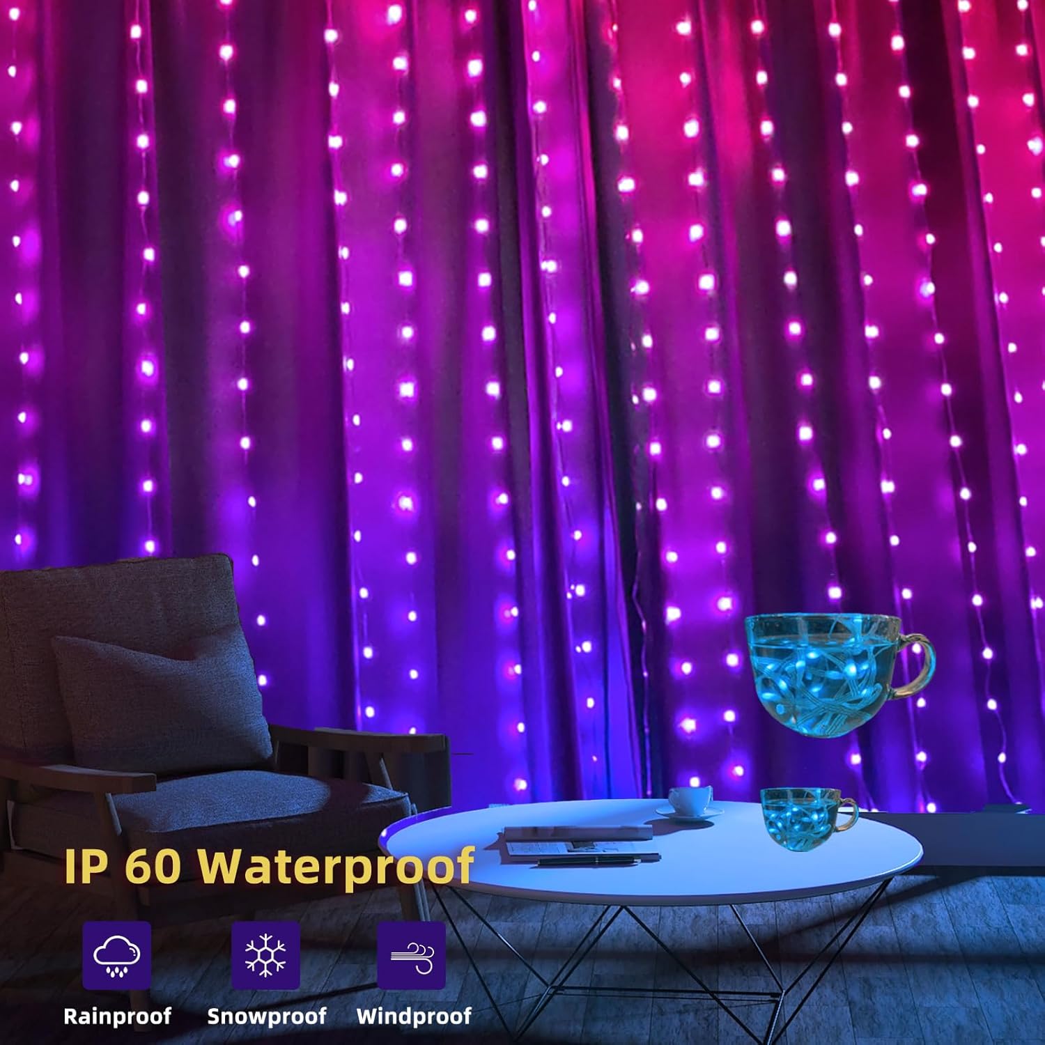 QINER LED Curtain Lights Indoor, 9.8 FT x 9.8 FT 300 LED with USB APP Control, Multiple Modes Selection, Smart Curtain Light for Bedroom, Wedding,Valentine's Day, Party