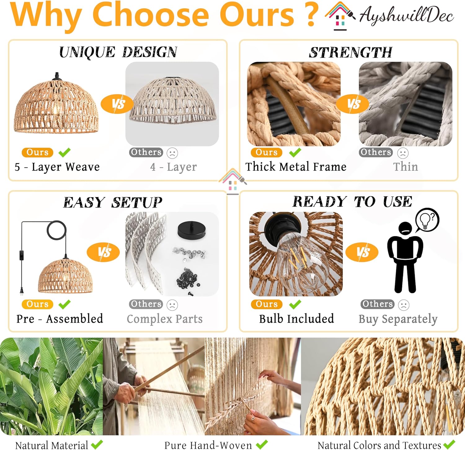 - [Suitable for any scene]: This 12.2 inch plug-in braided pendant light is suitable for kitchen island, dining room, living room, room, all kinds of places can bring you different experience, braided twine light with plug-in cord is more flexible and convenient to use, you can choose its installation position according to your actual need.