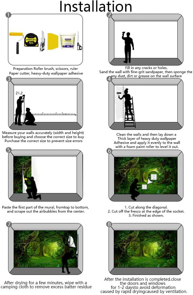 - Installation steps 1. Fill in any cracks or holes and clean the surface of the wall of dust, dirt and grease.2. Apply heavy-duty wallpaper paste to the wall, not the mural.3. Mark the position of each strip of wallpaper with a spirit level.4. Align the pattern and slide it into place.5. Scrape the bubbles with a spatula.6. Let it dry for a couple of minutes and it's ready to go!