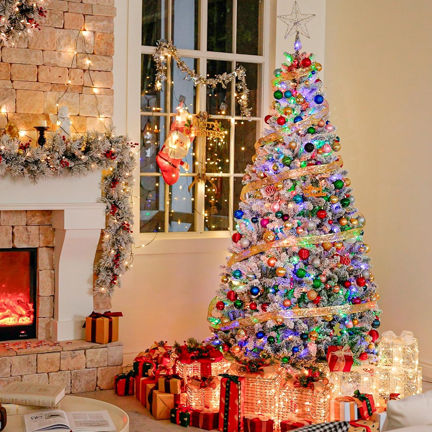 - PRE-LIT CHRISTMAS TREE: The 7.5ft snow flocked Christmas tree add a mesmerized festive atmosphere to your home by changing 450 pre-strung lights from warm white to multicolor with the touch of a button. The bulbs are UL certificed, safely designed to remain lit even if one burns out. Included is a foot pedal switch to control 10 different light colors and actions.