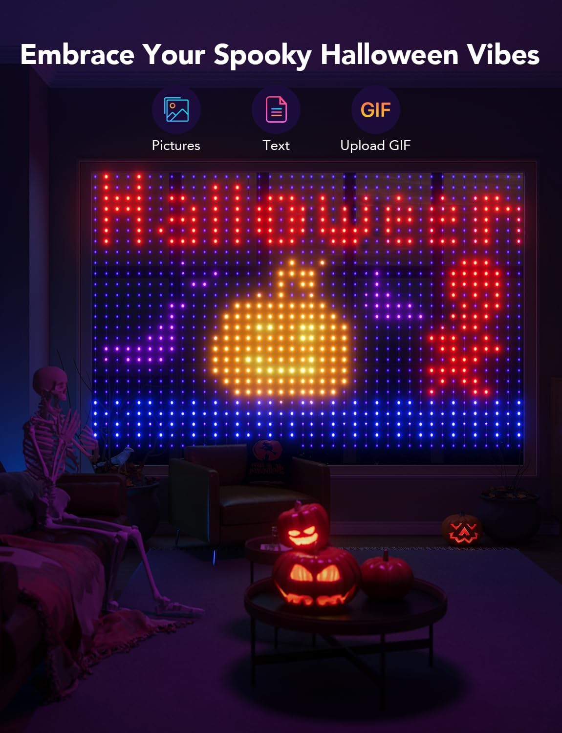 - DIY Your Canvas: With 5 canvas layers, add more dimension to your lighting effects with Govee Wi-Fi LED Curtain Lights. You can also upload pictures and GIFs for a fun animated decoration to complete your space. Note: GIF function only works with one set.