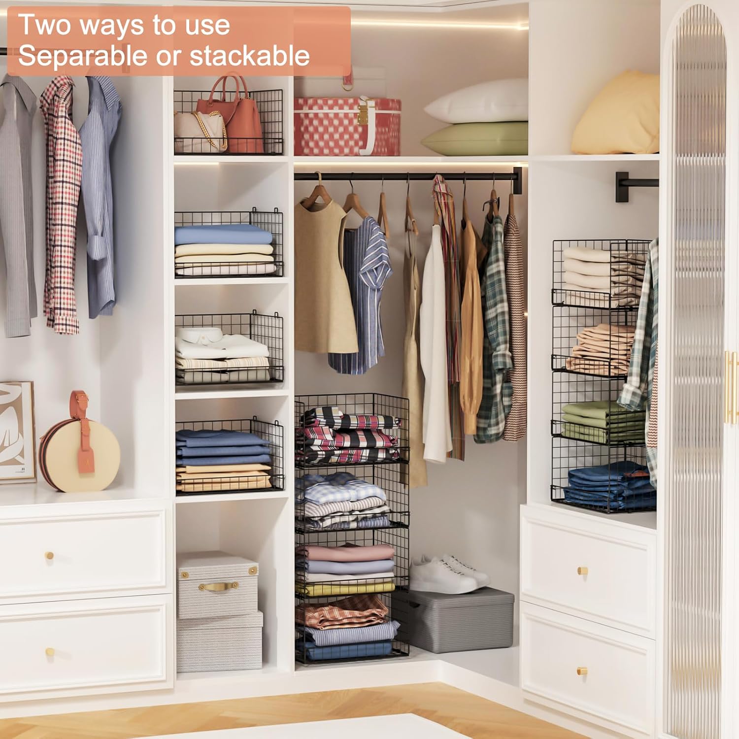 4-Tier Stackable Closet Organizers and Storage Shelves, Clothes Shelf Organizer Basket Bins, Foldable Sweater Storage for Closet Organizer System, Black (Patent Pending)