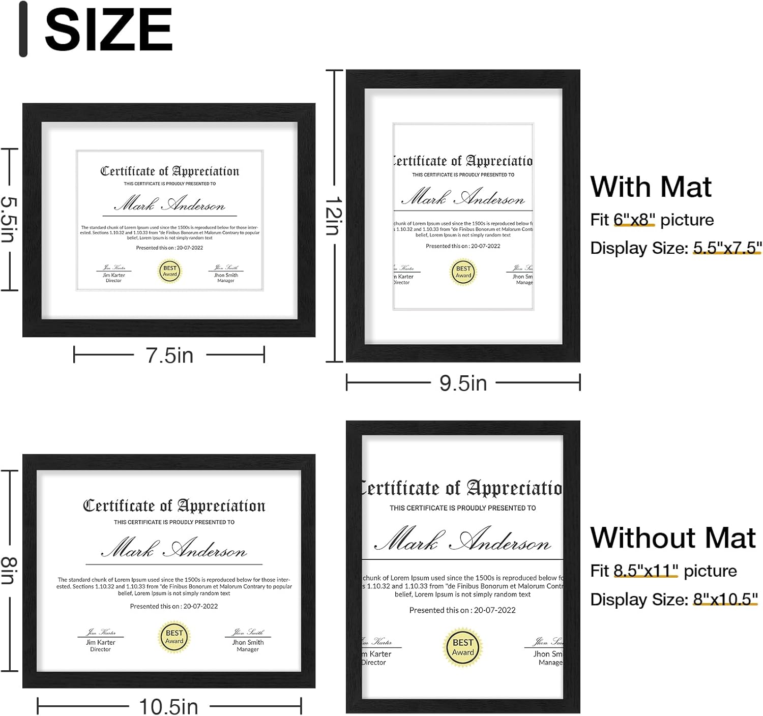 - Size: Each set includes nine 8.5x11 frames with white mats for 6x8 photos, or without the mat for 8.5x11 pictures. The frames are 0.78 inches wide and 0.5 inches thick. The opening of the frame and mat is slightly smaller than the picture itself