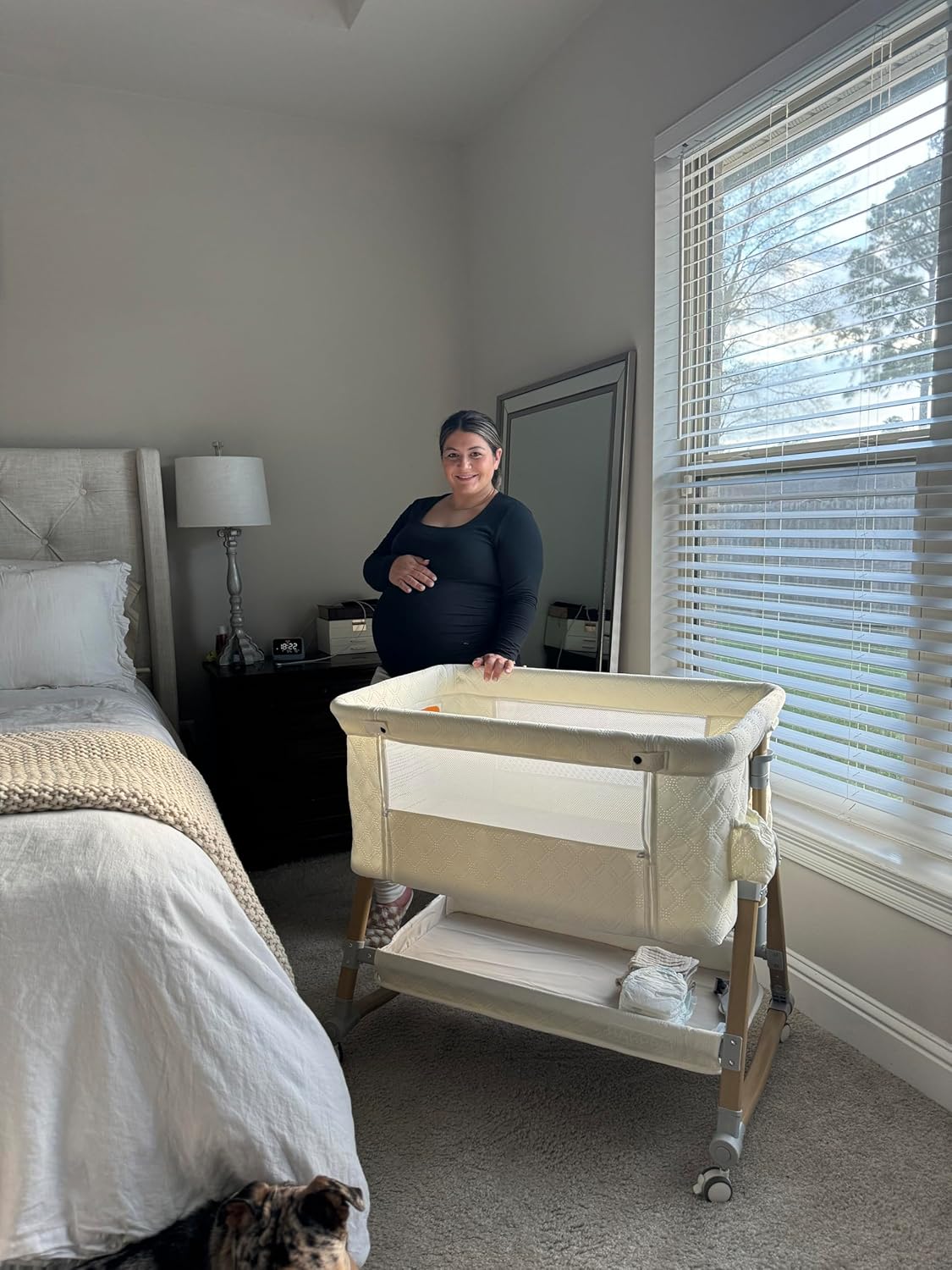- Sturdy and Stable: Built with a robust triangular structure and durable aluminum frame, and equipped with anchor straps and 4 locking wheels, this bedside bassinet for baby securely attaches to your bed or floor, preventing any gaps or movement