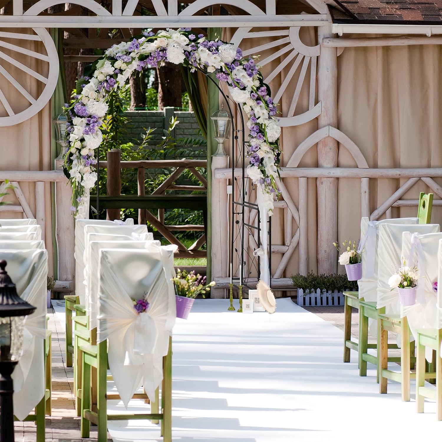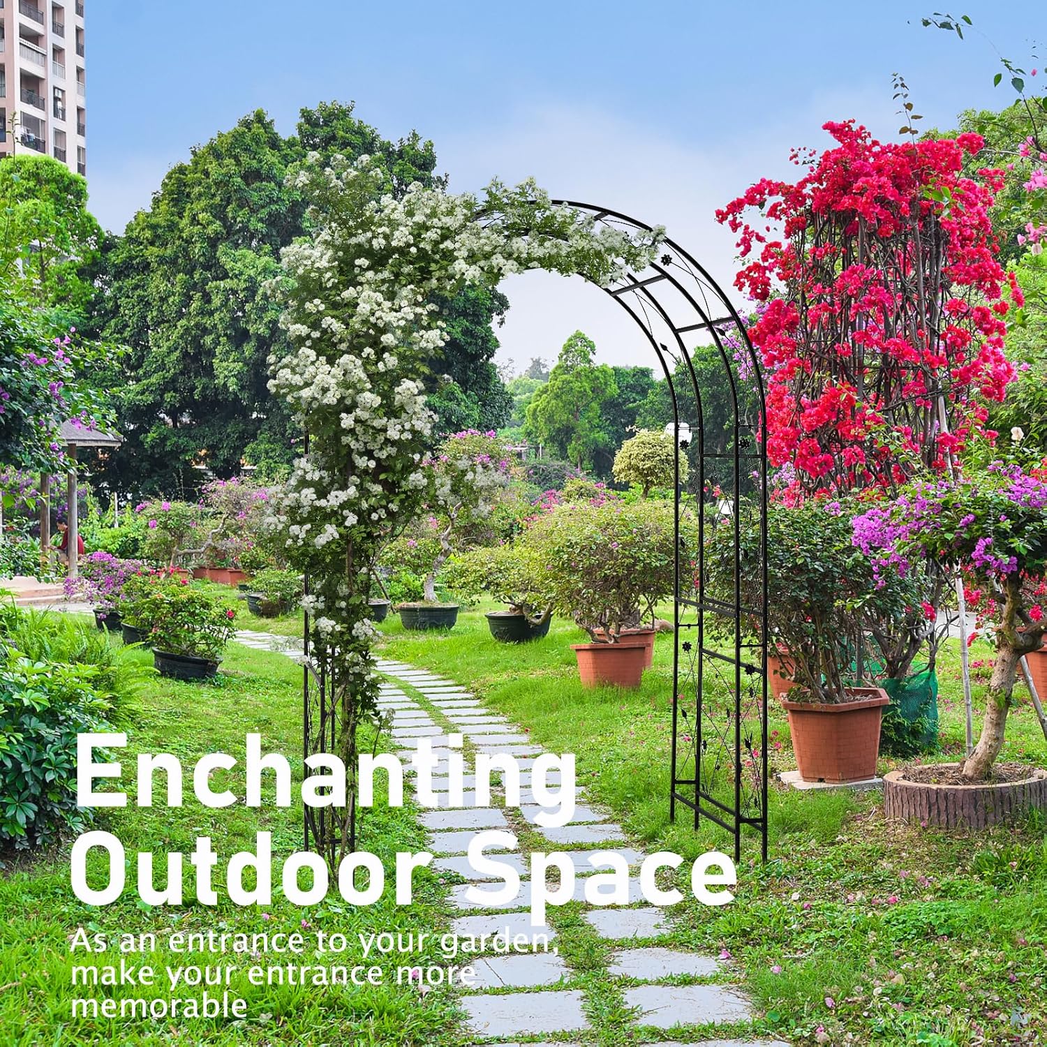 - Elegant Arch: Whether standing alone or covered with climbing vines and flowers, these outdoor metal arch add a striking focal point to your yard. Adding grace and prominence to any outdoor venue with the Arbor features squared lattice side panels