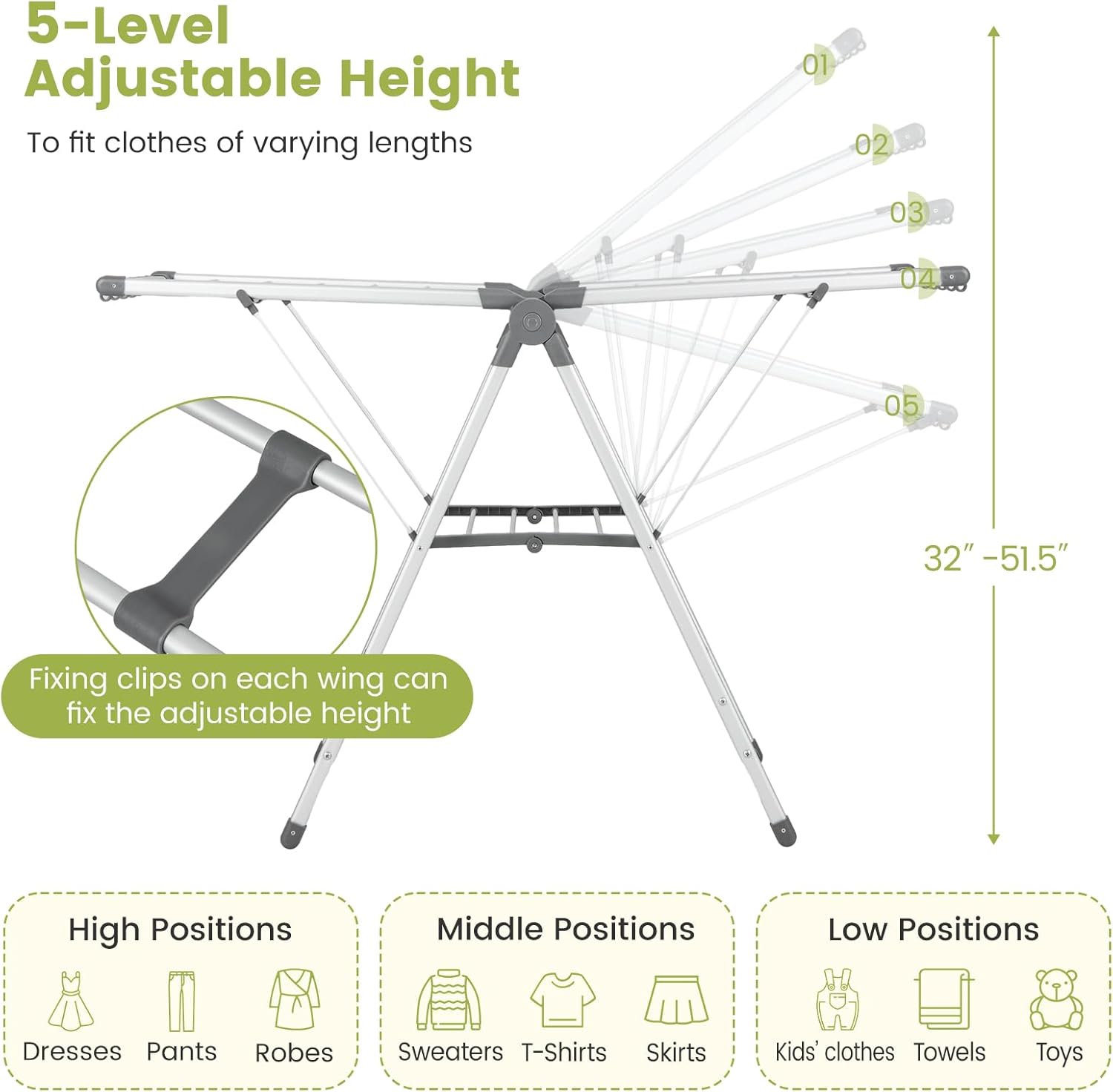 - [5-Level Adjustable Height]: Equipped with 2 height adjustable wings, this laundry hanger can be adjusted to 5 heights (32”-51.5”) to fit clothes of varying lengths. Plus, the fixing clips on each wing can fix the adjustable height.