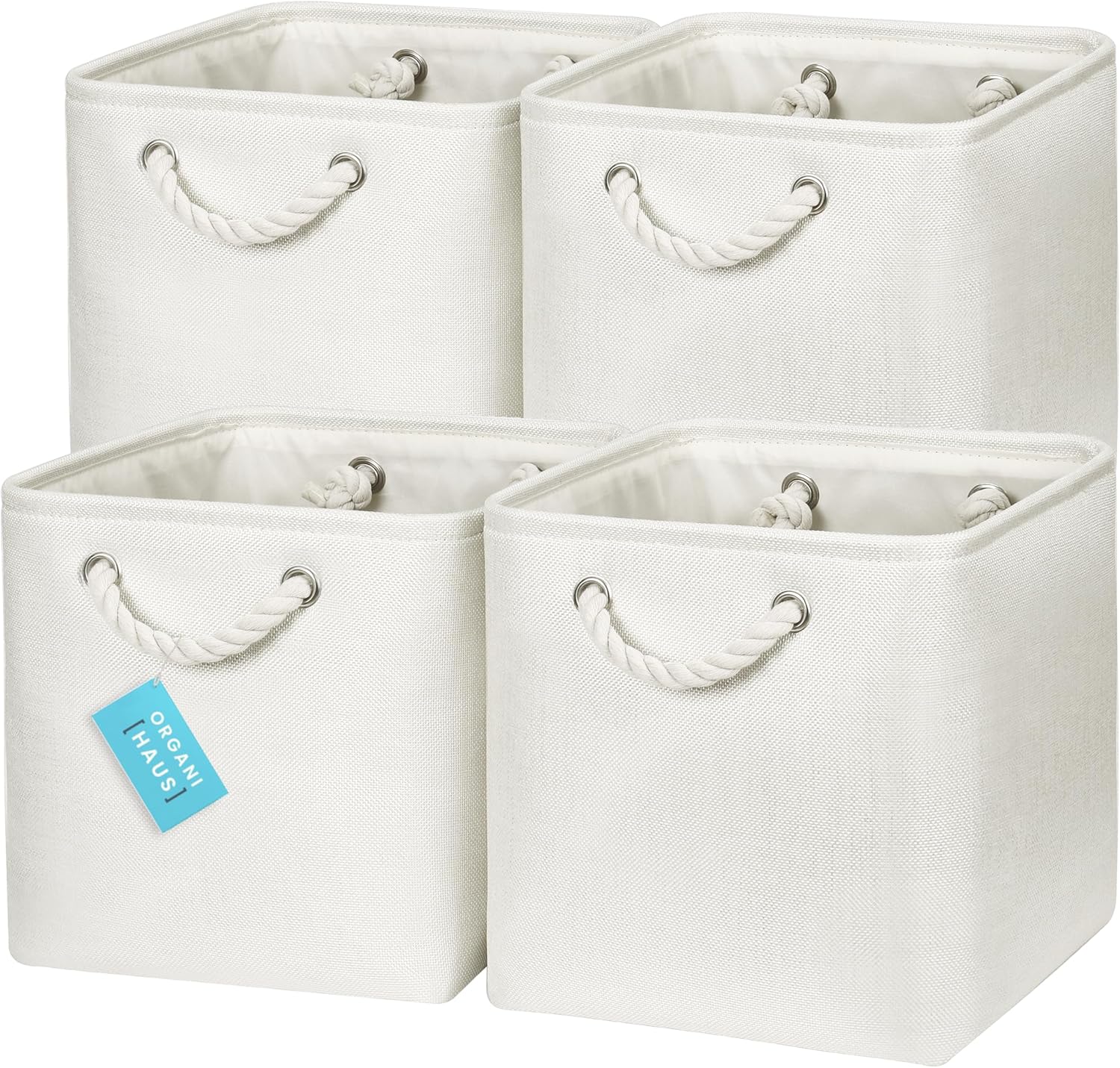 OrganiHaus 11x11 Cube Storage Bins 4 Pack, Foldable Cube Storage Organizer w/ Rope Handles, Collapsible Fabric Bins for Toys, Clothes & Closet Organization, Fabric Square Baskets - Off-White