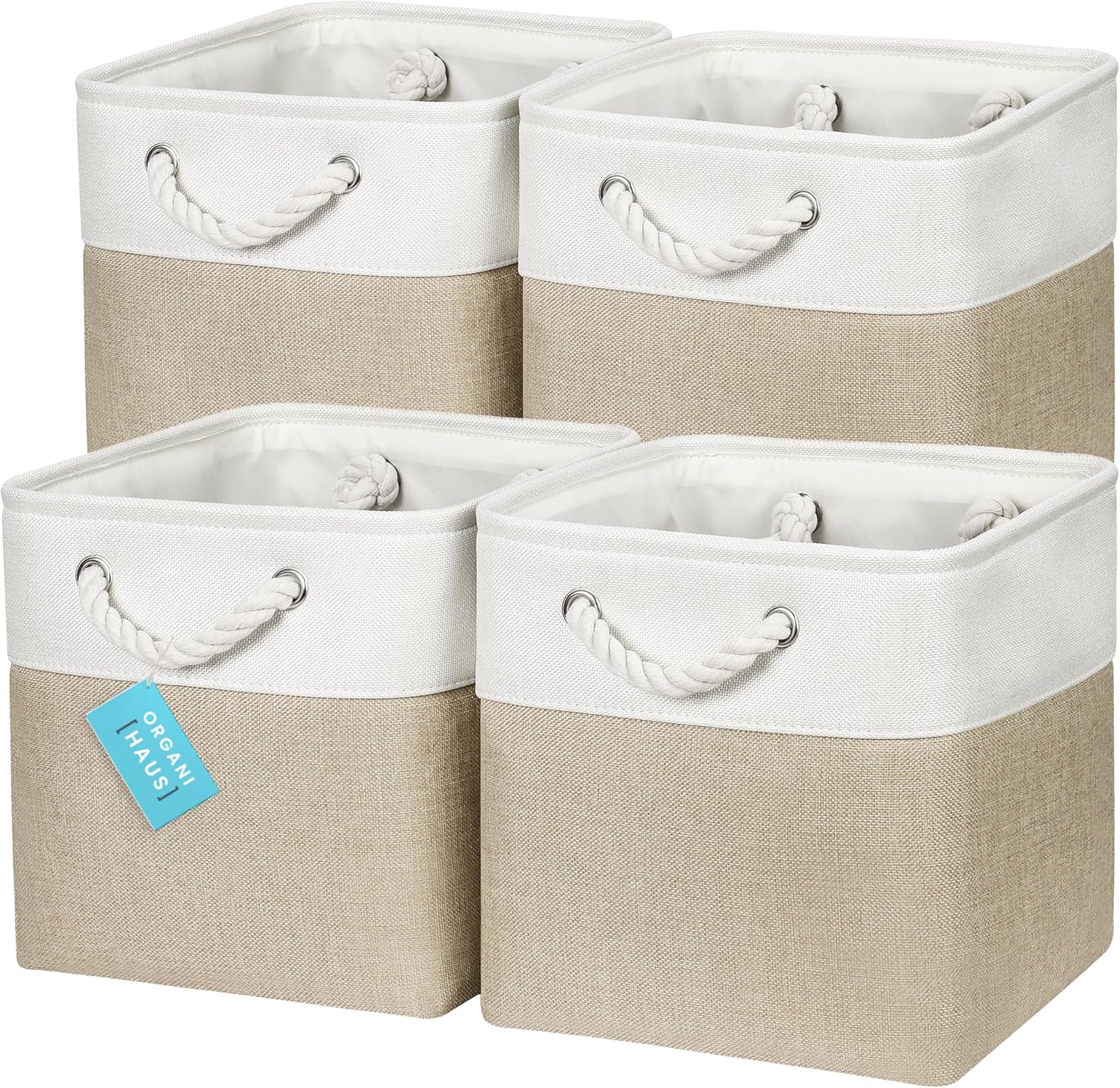 OrganiHaus 11x11 Cube Storage Bins 4 Pack, Foldable Cube Storage Organizer w/ Rope Handles, Collapsible Fabric Bins for Toys, Clothes & Closet Organization, Fabric Square Baskets - Beige/White
