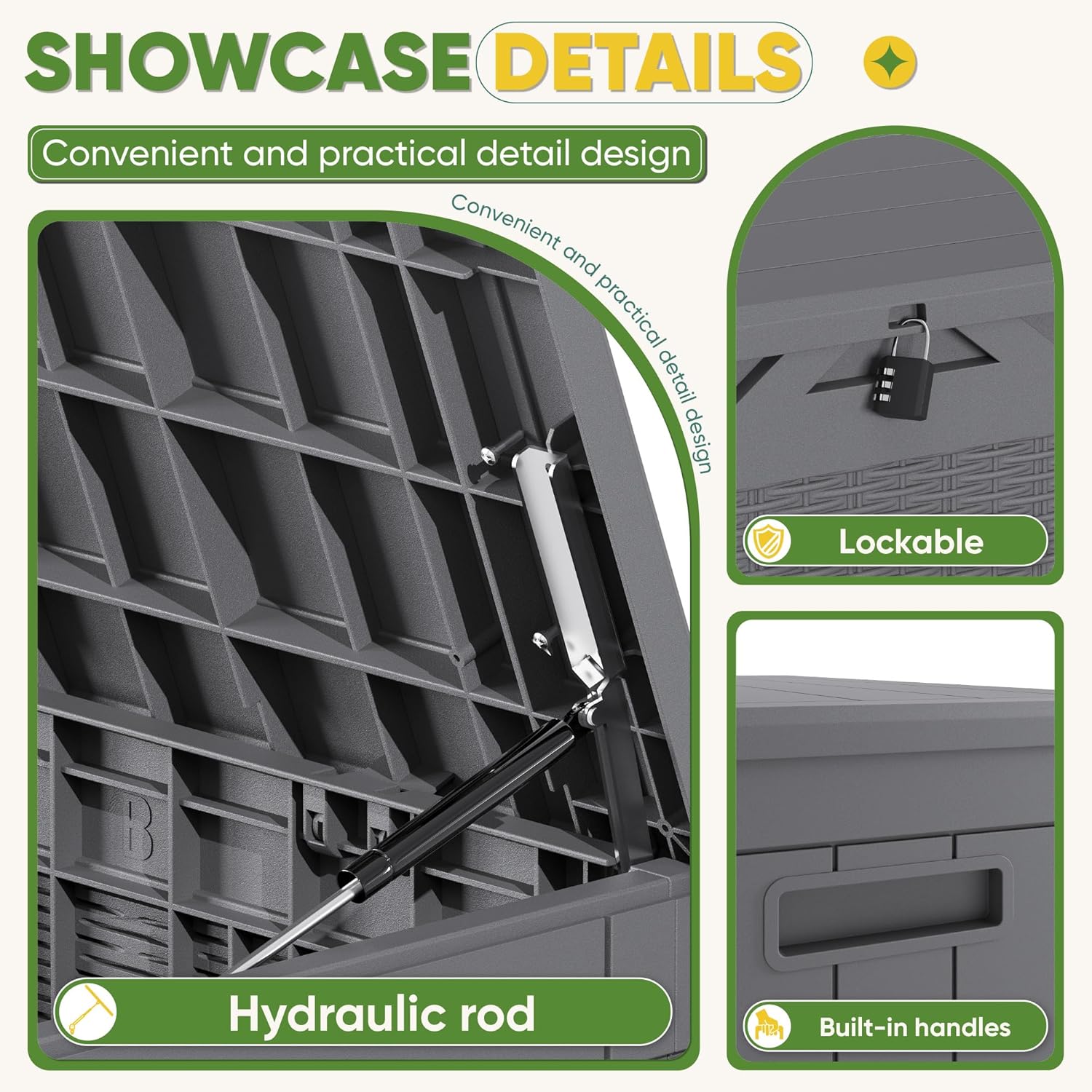 - WIDE VERSATILITY: The 100 gallon storage box can not only help you organize your patio or lawn. It can also be used as a table or bench when you need it, and the lid is equipped with a support bar inside, which can greatly enhance the stability and weight-bearing capacity of the storage box.