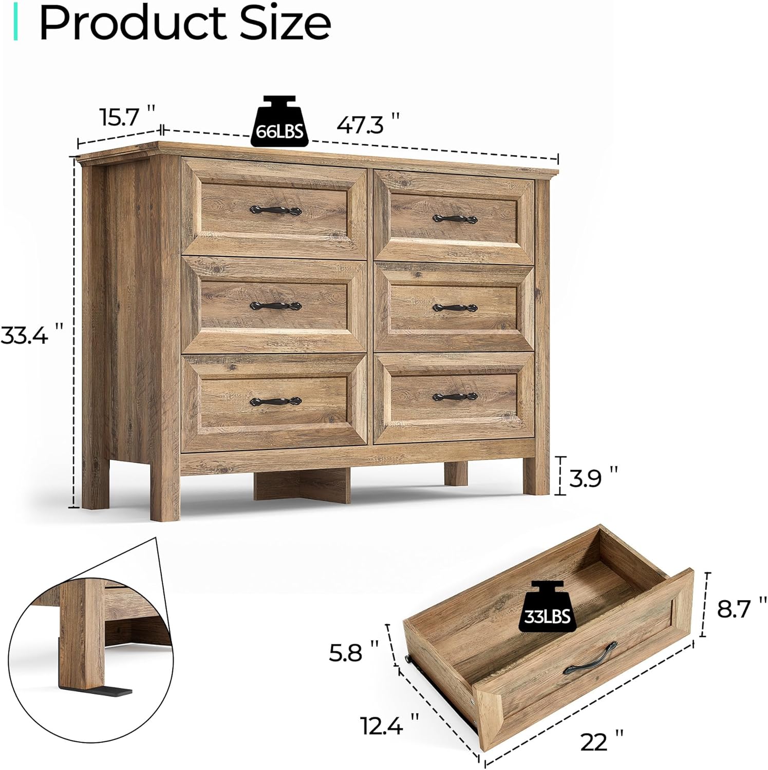 - ăSpace SavingăWith 6 spacious drawers measuring 20.7â L x 13â W x 4.7â H, our dresser is perfect for storing adorable blankets, diapers, and more. We've added additional corner blocks to make it sturdier and long-lasting.
