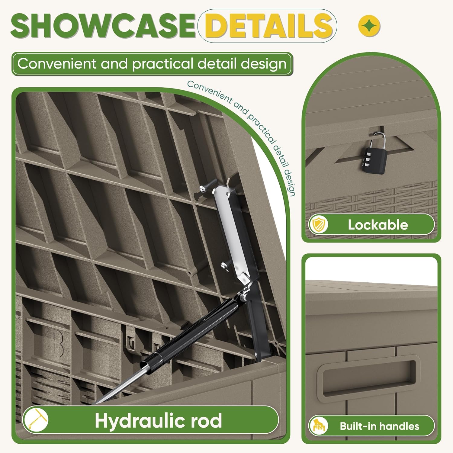 - WIDE VERSATILITY: The 100 gallon storage box can not only help you organize your patio or lawn. It can also be used as a table or bench when you need it, and the lid is equipped with a support bar inside, which can greatly enhance the stability and weight-bearing capacity of the storage box.