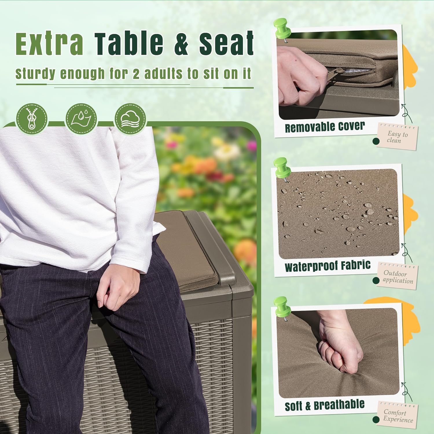 - EXTRA CUSHION:Besides helping you to organize your space, the deck box is equipped with a removable thick cushion, you can also use it as a stool to ensure your safety when opening and closing the box.