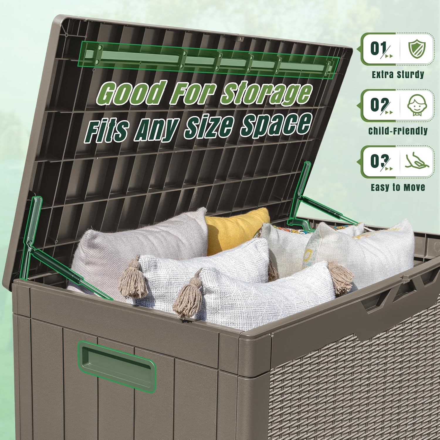 - LARGE STORAGE SPACE: The 100 gallon storage space allows you to store more items with it. Whether it's garden tools or fabrics like clothes and pillows, it can meet your storage needs and keep your space organized.