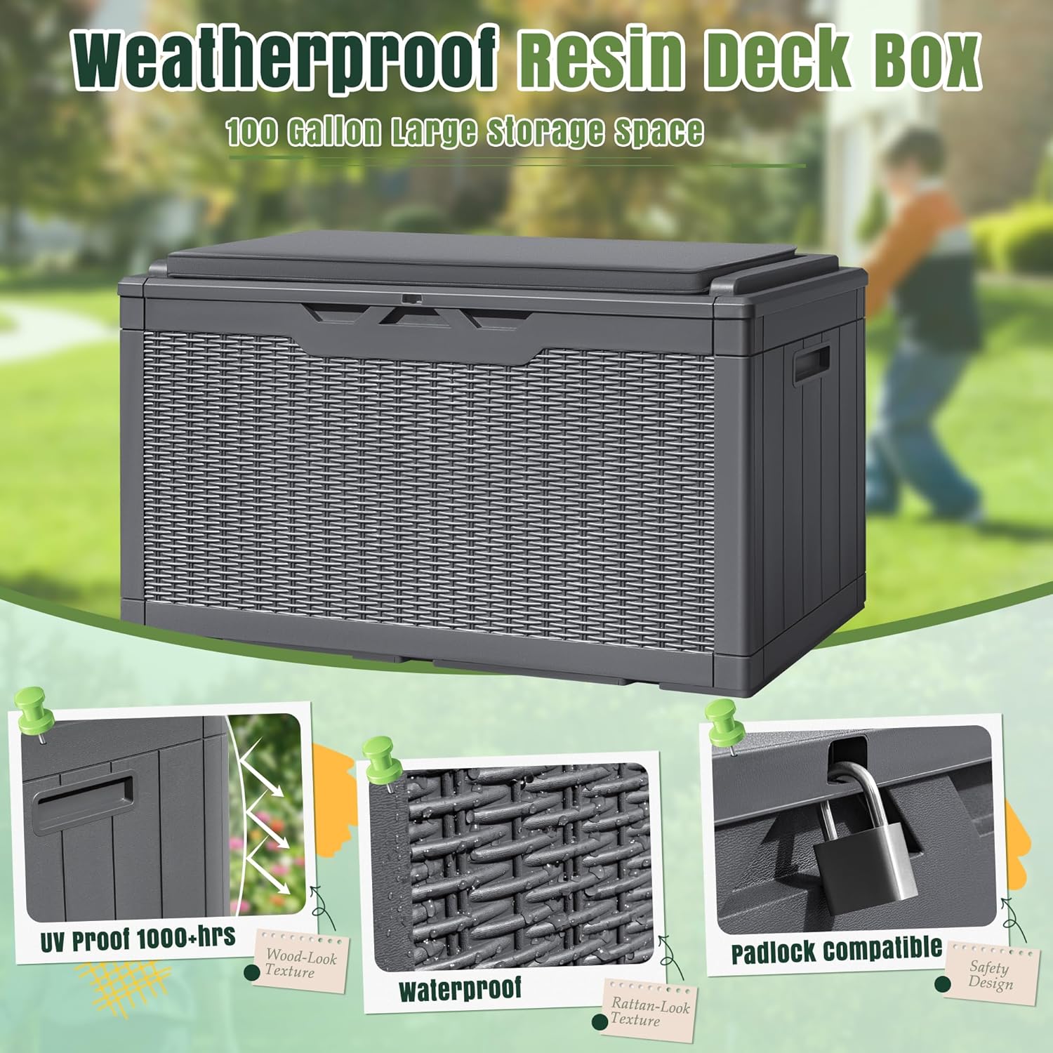 Greesum 100 Gallon Resin Deck Box Large Outdoor Storage with Cushions for Patio Furniture, Garden Tools, Pool Supplies, Weatherproof and UV Resistant, Lockable, Gray