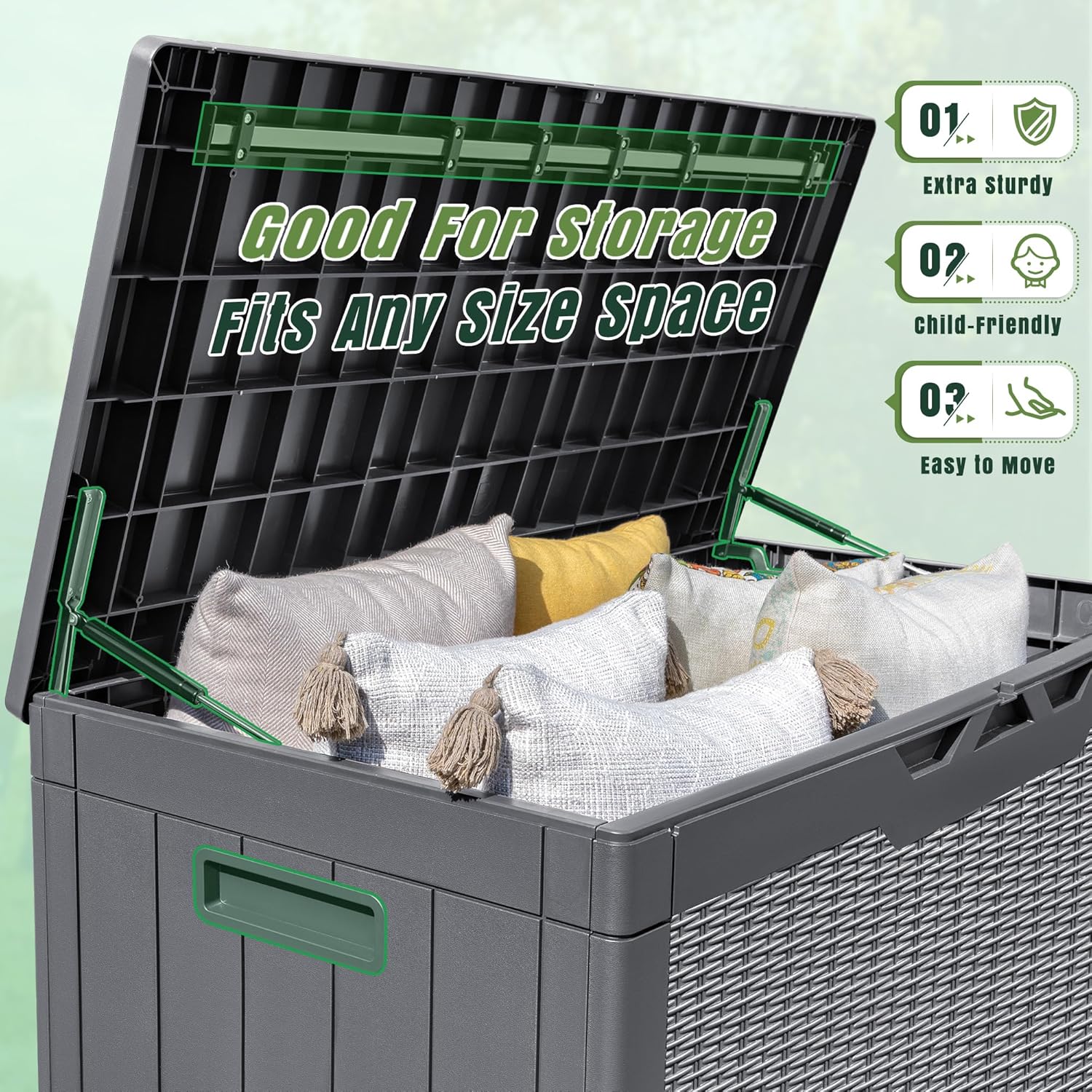 - EXTRA CUSHION:Besides helping you to organize your space, the deck box is equipped with a removable thick cushion, you can also use it as a stool to ensure your safety when opening and closing the box.