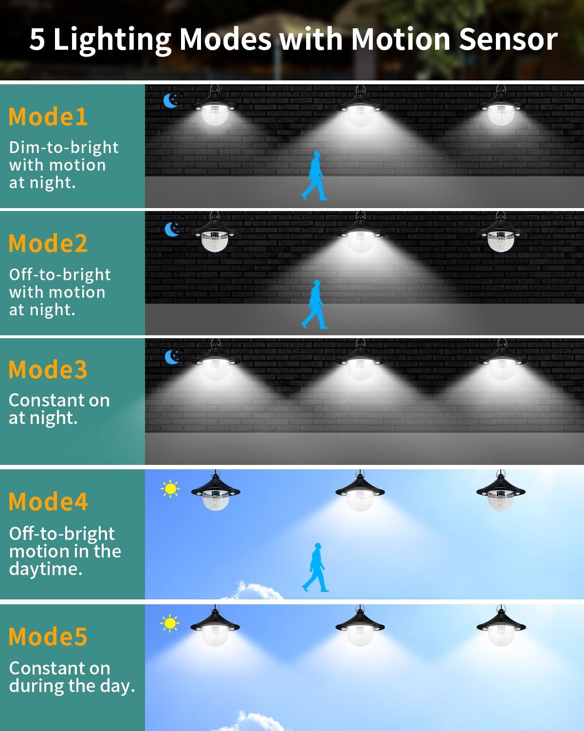 - 【3 Night Modes & 3 Sensor Time Options】This solar indoor lights comes with 3 night working modes. Mode 1: Stay dim, brighten for 15s when motion is detected. Mode 2: Stay off, hight light for 15s when motion is detected. Mode 3: Always on at night. This solar garage light also has 3 induction times (25s/35s/45s) to choose from to meet your different induction time needs.