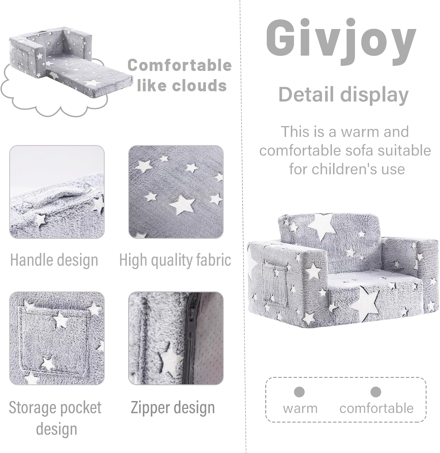 Toddler Chair Plush Kids Couch, 2-in-1 Comfy Armchair Removable and Washable Cover Carrying Handle, Convertible Reading Chair Toddler Couch for Girls and Boys, Glow in The Dark Grey Star
