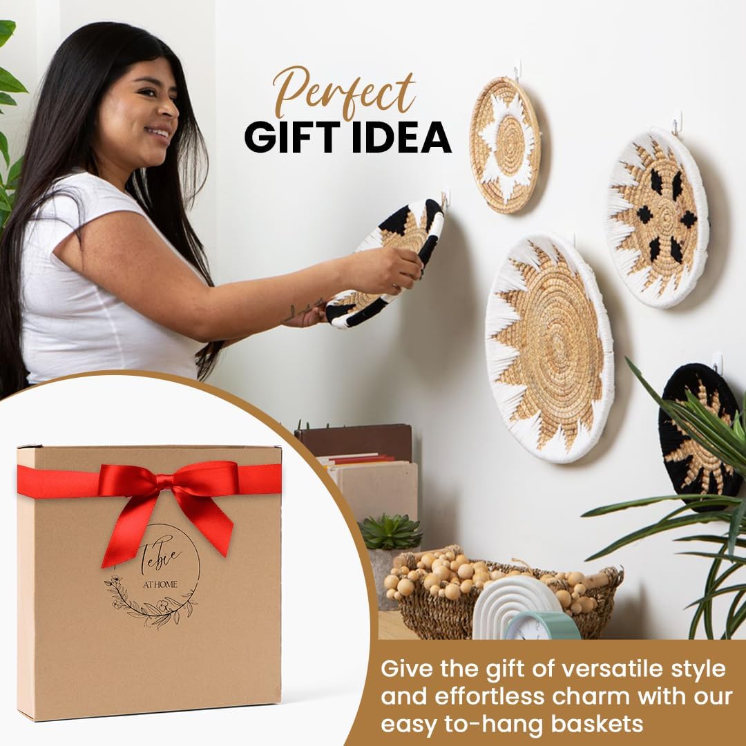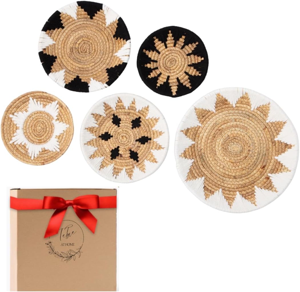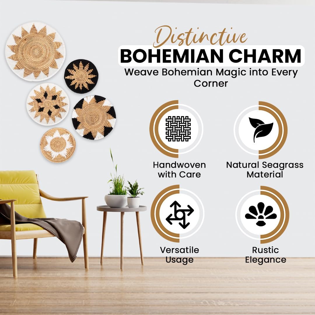 Tebie At Home Boho Wall Art - Boho Wall Baskets Decor - Handmade Set of 5 Woven Baskets With Seagrass - Flat Elegant Art for Farmhouse and Rattan Decor for Living Room, Bedroom and Office
