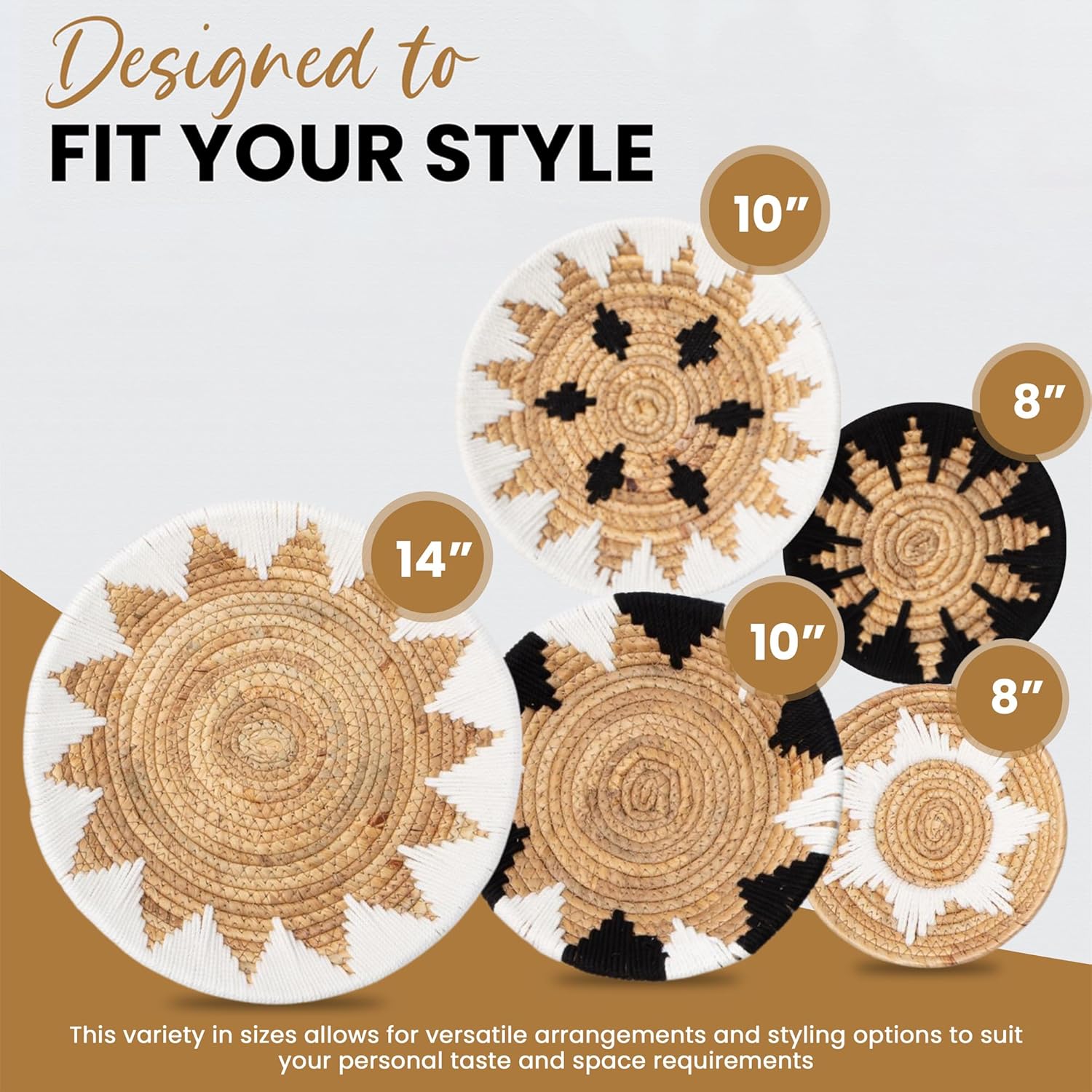 - ๐๐๐ซ๐ฌ๐๐ญ๐ข๐ฅ๐ ๐๐๐ญ ๐ฐ๐ข๐ญ๐ก ๐๐๐ญ๐ฎ๐ซ๐๐ฅ ๐๐ข๐๐๐ฌ: You will receive a wall basket decor set featuring one large basket (14 inches), two medium baskets (10 inches), and two small baskets (8 inches), offering versatile design to match your style. They bring a natural touch with their hanging wicker and woven design. The design and colors work for any boho wall basket decor.