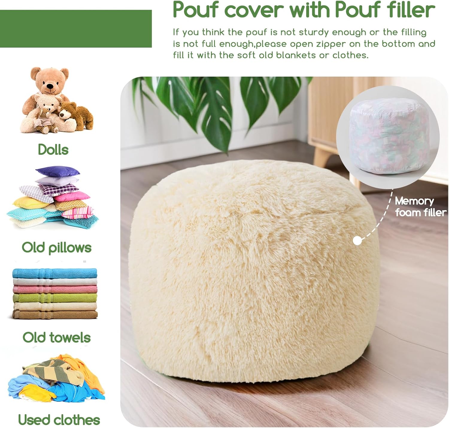 - For convenience and ease of use, this pouf ottoman comes pre-filled with memory foam chunk pouf filler, which can be easily inserted through the large round opening on the bottom with double zippers.