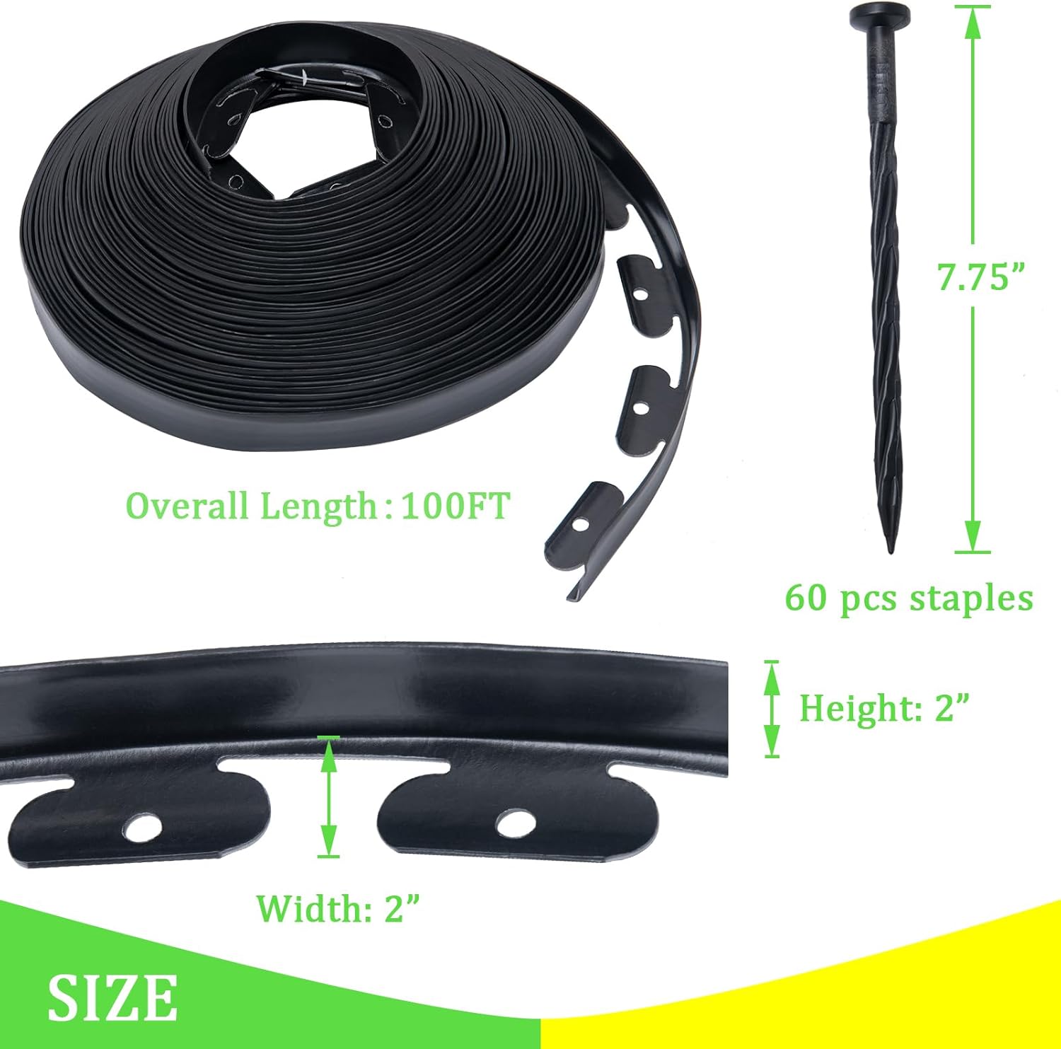 Landscape Edging 2 Inch Tall 100 FT, Garden Edging Border with 5 Pcs Connectors and 60 Pcs Anchoring Spikes for Garden Flower Beds Yard Lawn