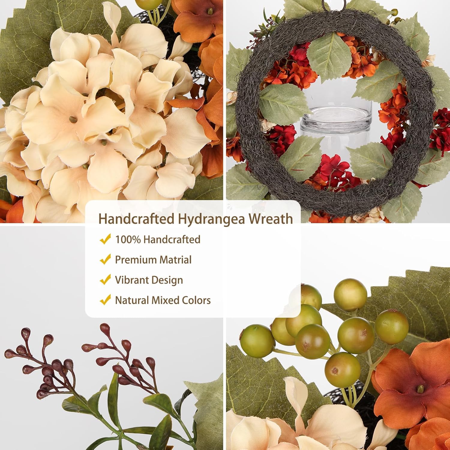 - Decorative Fall Wreath - This door wreath features hydrangea in different colors, with its elegant blend of artificial hydrangeas in brownish red, dusty orange and light apricot, there has lifelike leaves, mixed color berries and wildflowers branches, which are adorned on realistic twigs base, full of different layers and textures, the fall hydrangea wreath is a stunning door decor that perfectly captures the essence of autumn and is a perfect way to welcome guests into your home this autumn