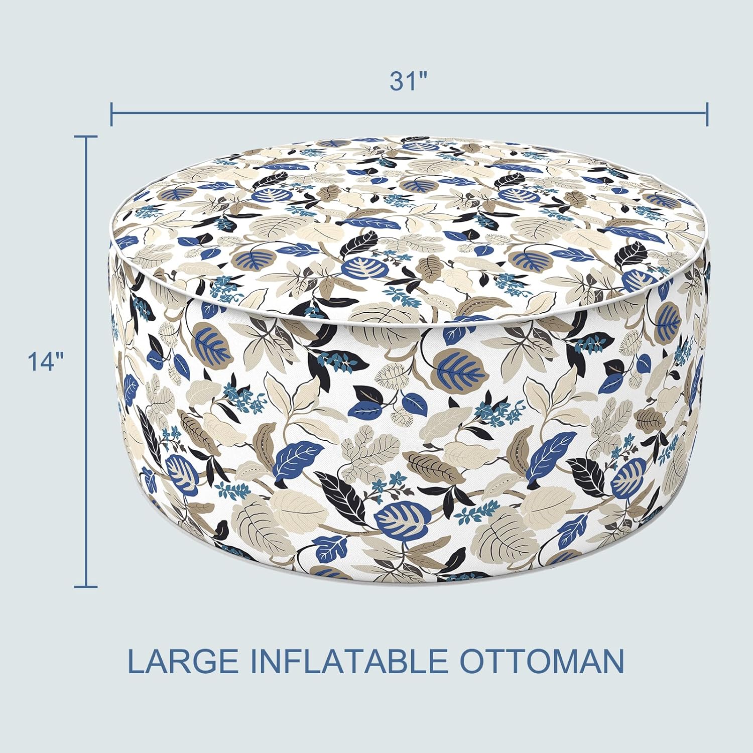 - Package Including: 1 pc inflatable large round ottoman measures D31" x W31" x H14". Great as a footstool or seat. Fashion printed cover and sturdy PVC liner