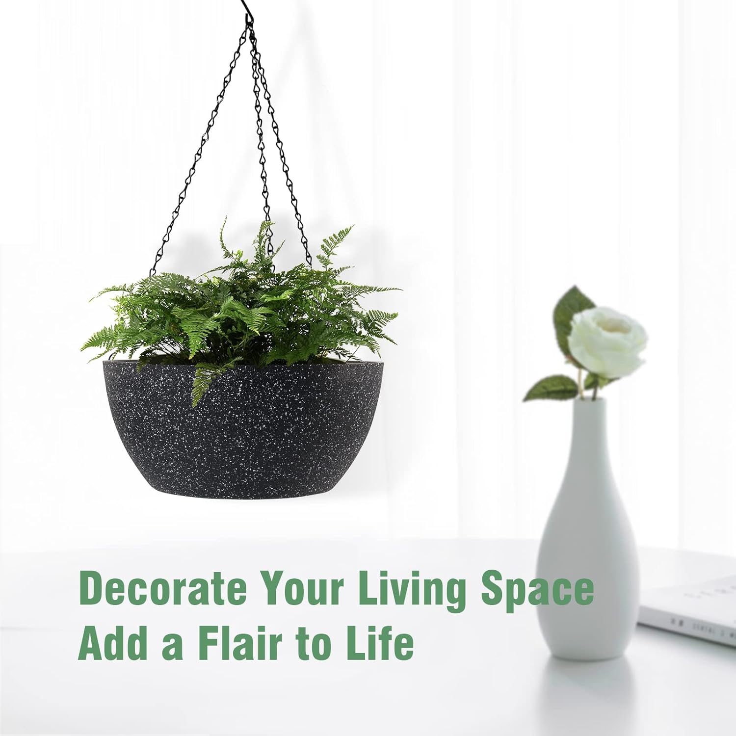 10 inch Hanging Planters for Outdoor Indoor Plants with Drainage Holes and Chain, 2 Pack Round Hanging Flower Pots for Garden Home Porch Decor, Speckled Black