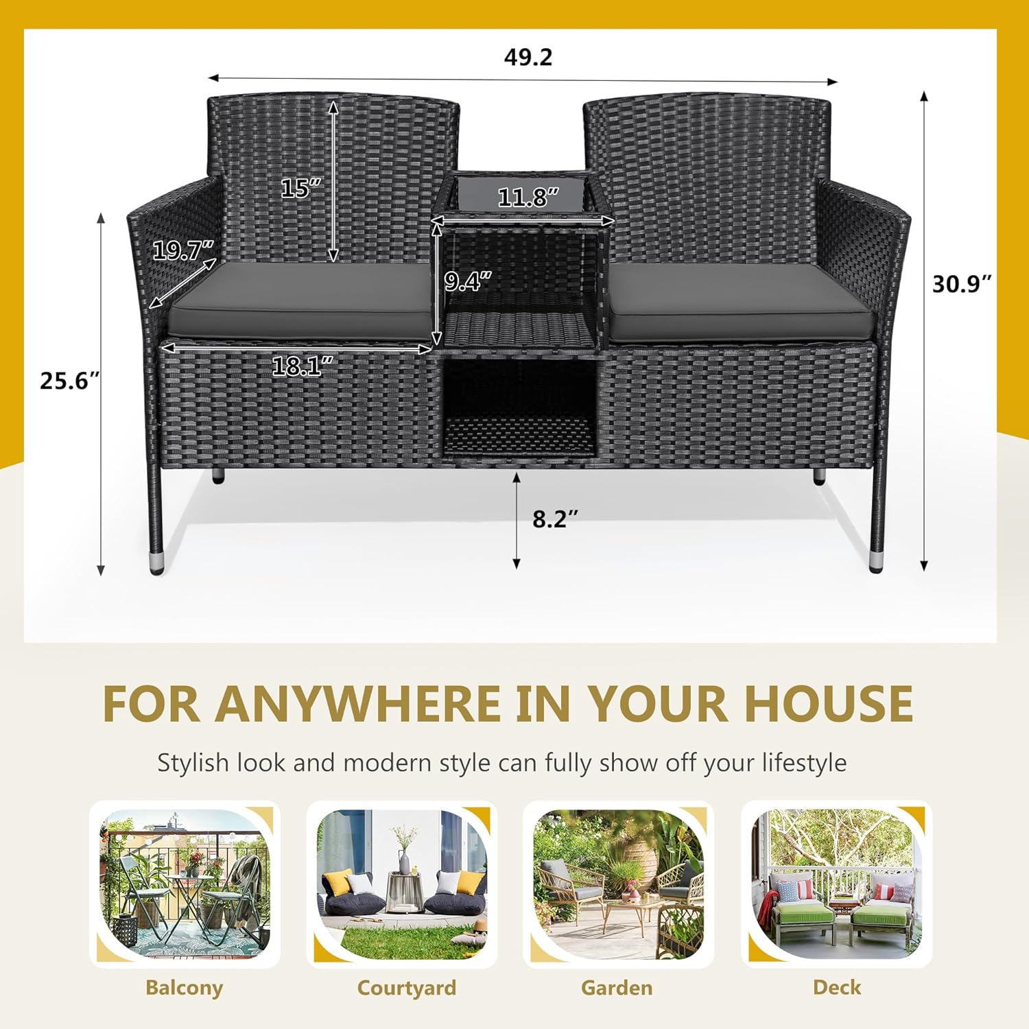 - Built-in Table & Storage: In the middle of the patio loveseat integrated storage compartment and small table, you can put some drinks, snacks, fruits within your reach in the tempered glass top. The small storage space below you can put books, tea cans and etc. This design saves your space and add more convenience.