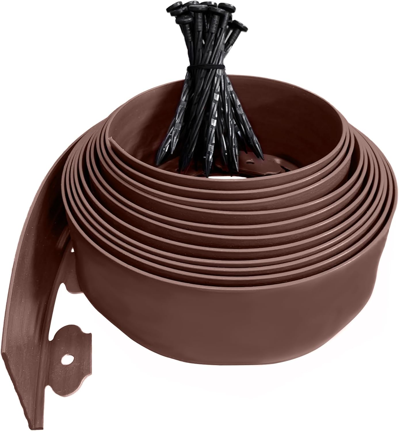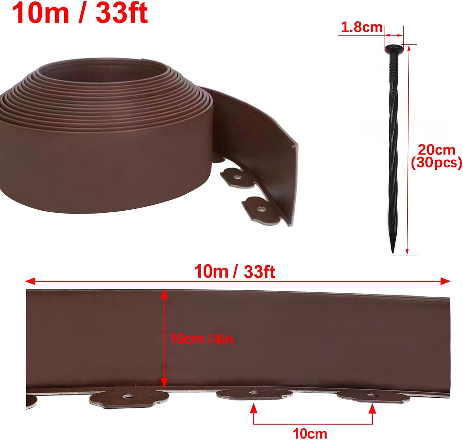 Garden Edging 33FT, 4IN High Landscape Edging Border Plastic Lawn Edging Roll with 30 Spikes for Yards, Flower Bed Edge, Sidewalks, Pathway, Brown