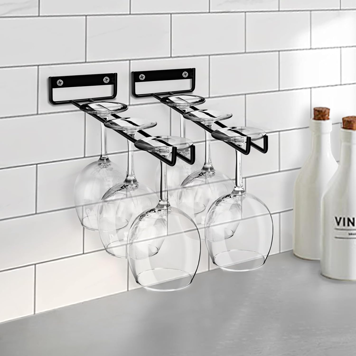 - Under Cabinet Wine Glass Rack (2 Pack): Mounts directly under cupboard for visible storage of your glassware - Stores 3 of your favorite stemmed wine glasses or 4 champagne glasses per rack depending on the size - Can also be used as a mug shelf for mug storage - Use display shelf to organize your choice of glassware, china storage, bar wall decor, wine glass storage, and more