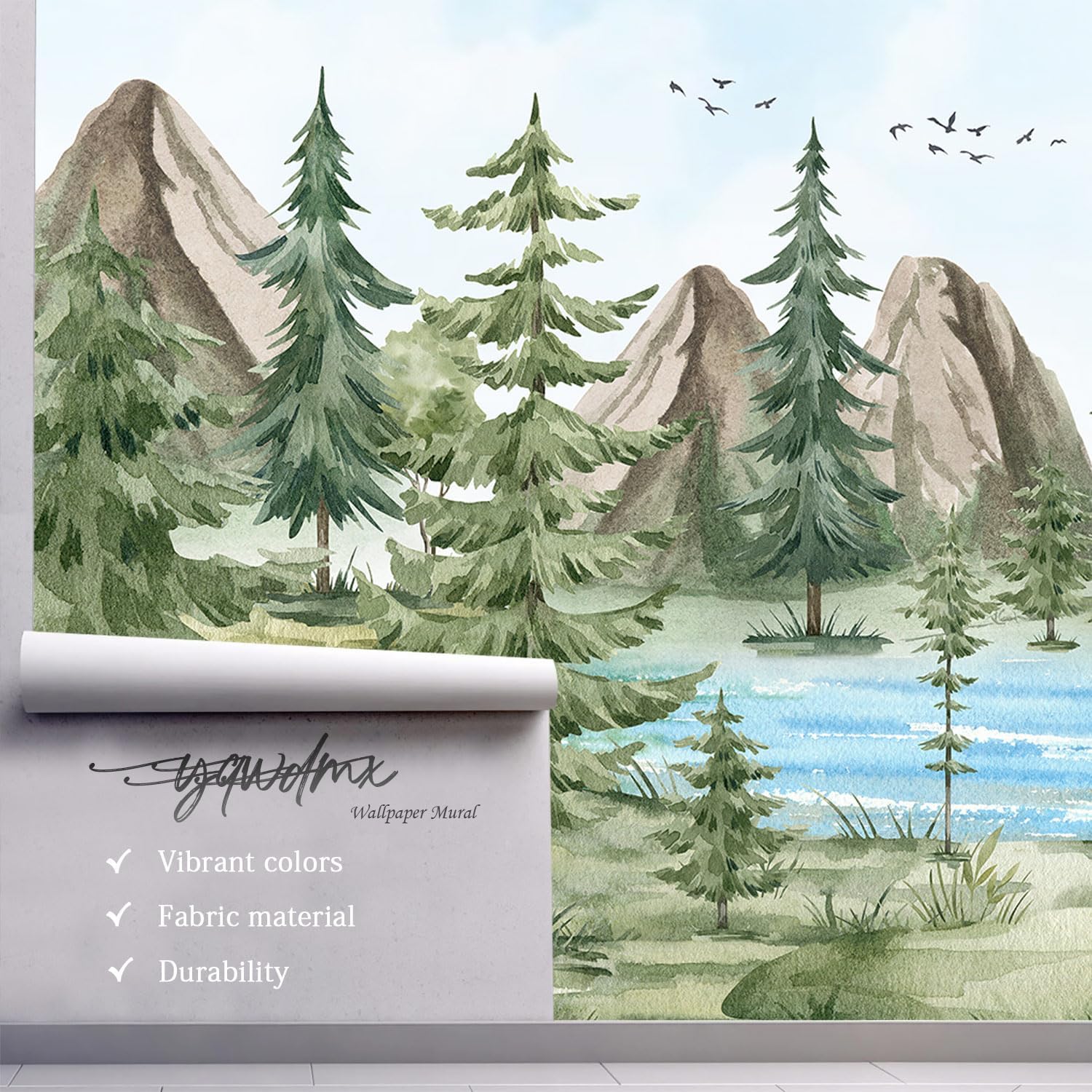 -Watercolor Green Pine Mural Cartoon Forest Fabric Wallpaper Children's Room 100" x 65"(Not Peel and Stick)