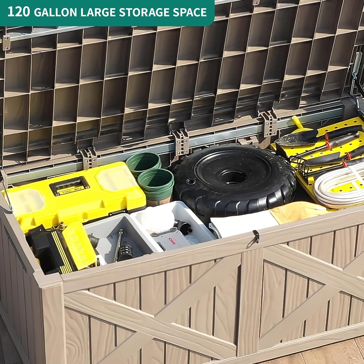 - LARGE STORAGE SPACE- 120-gallon capacity results in a roomy storage solution for your garden tools, pool supplies, sporting equipment, etc., on patio, deck, or porch