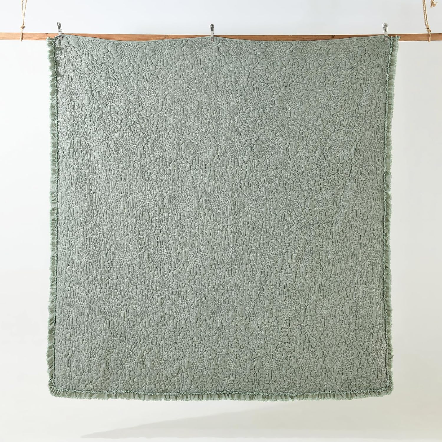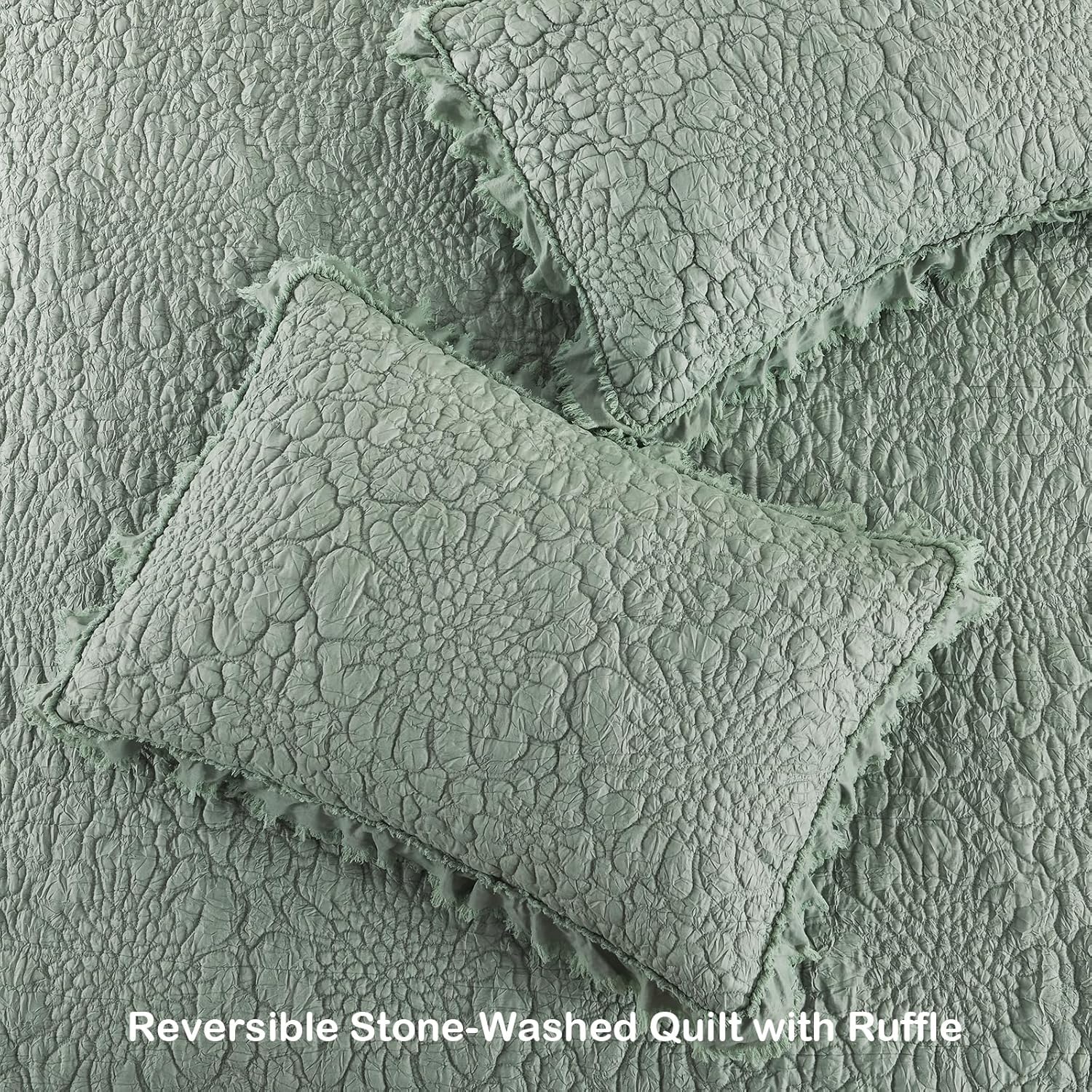 HORIMOTE HOME Sage Green Ruffled Quilt Queen Size, Stone-Washed Microfiber Lightweight Crinkled Farmhouse Rustic Shabby Chic Bedding Set, 3 Pieces Reversible Bedspread with Pillow Shams for All Season