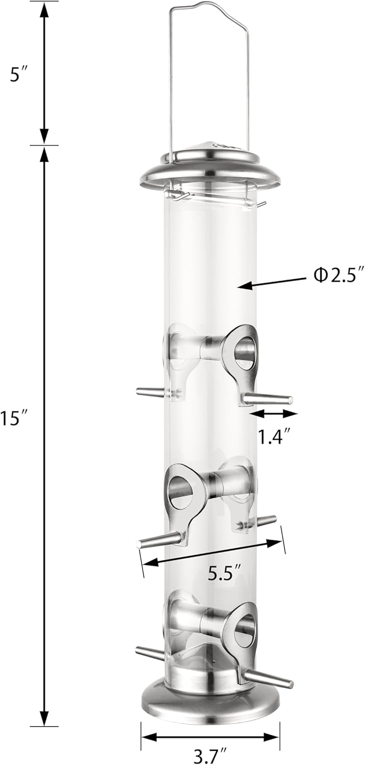 - 【Nickle Power Coated,No Color Fading, Great for all the year round feeding】Wear and Worn, Never Rust. All Metal top, base, feeding ports, perches, nickle power-coat,rust resistant, robust construction to sustain all weather days. It features royal-stylistic nickle outlook, traditional design inviting more feather birds to your garden, add more liveness to your garden life.