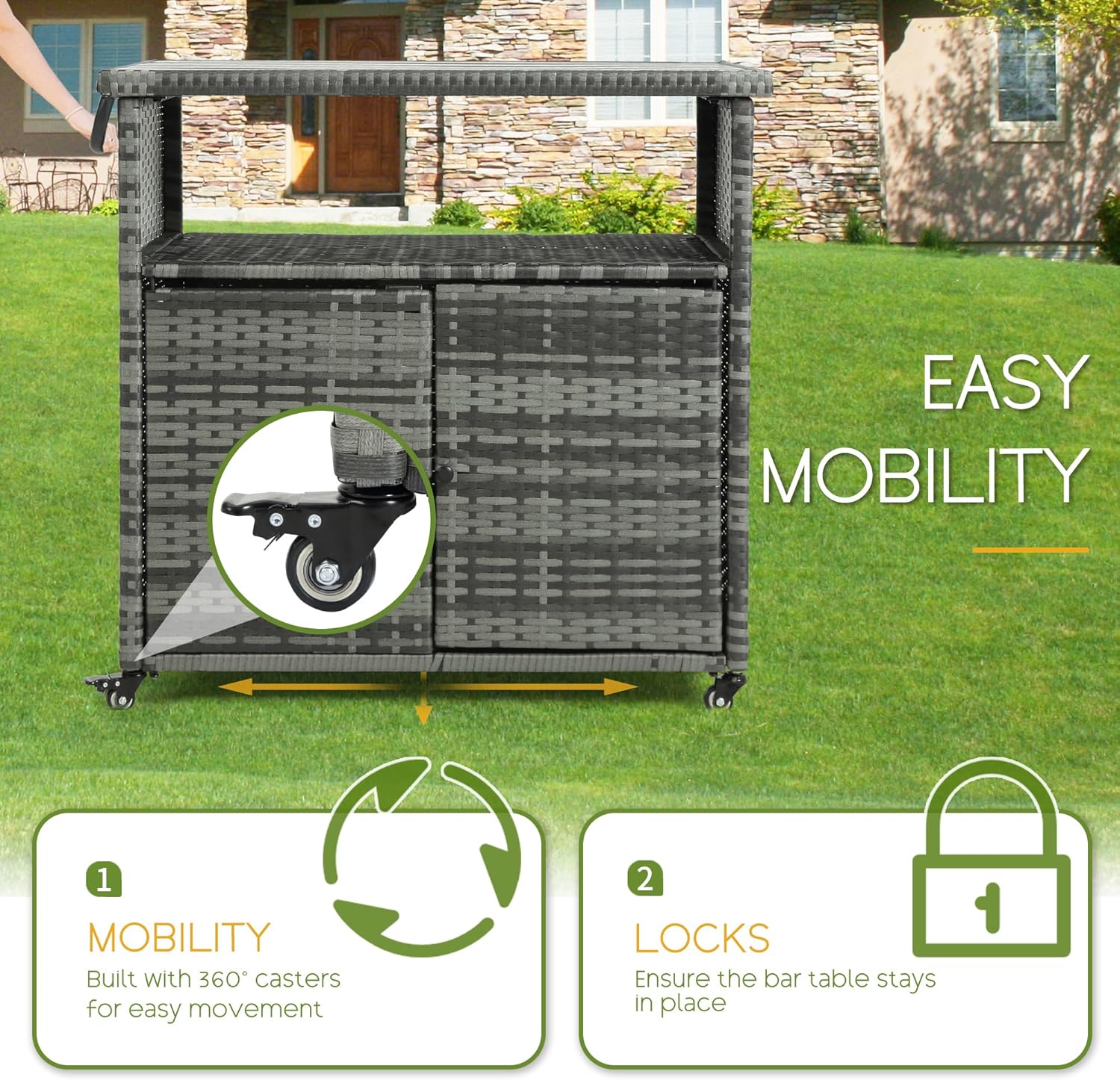 - DURABLE RELIABILITY: The outdoor kitchen cart is equipped with 360Β° smooth wheels for effortless movement to any position, and one side of the wheels is equipped with a locking feature to keep it in place