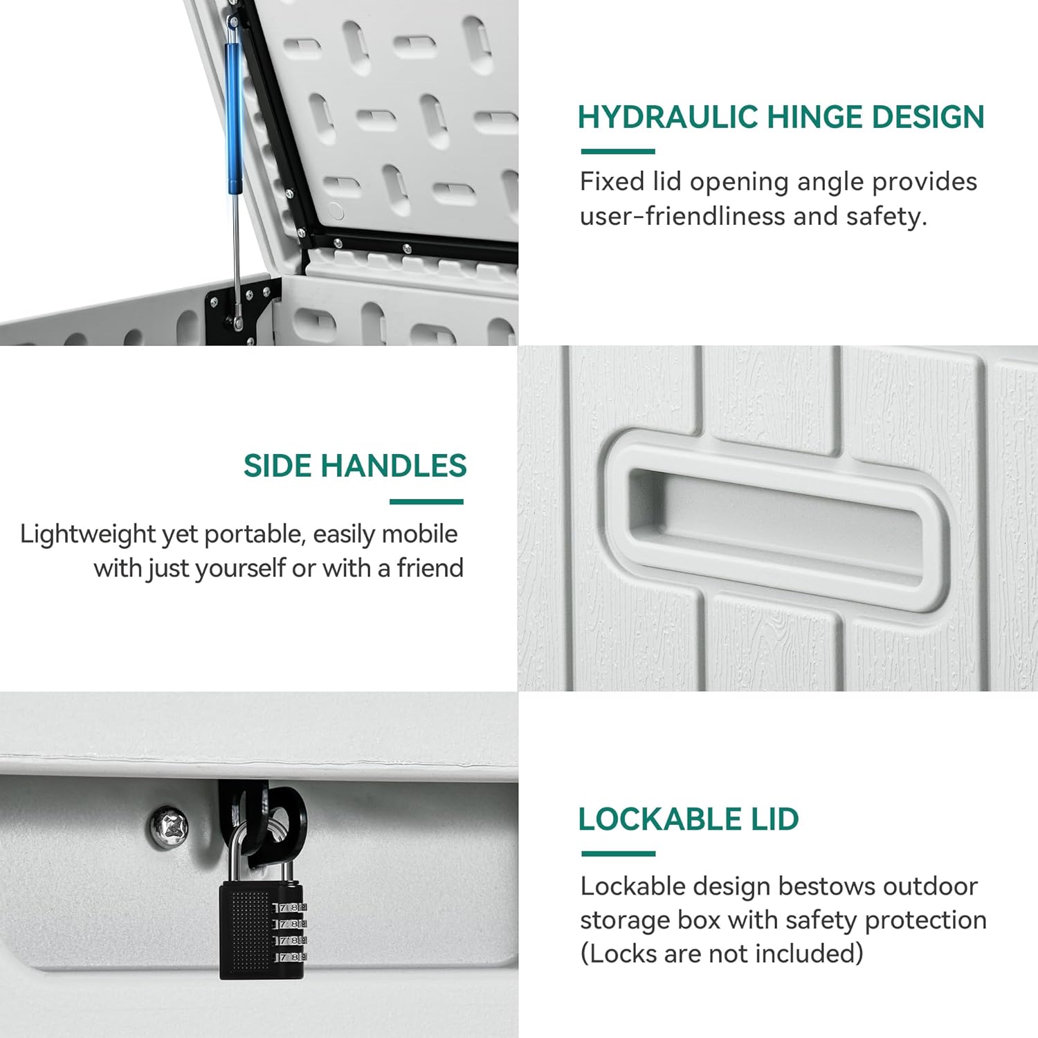 - XXL DECK STORAGE BOX:Boasts generous 260 gal capacity with outer dimensions of 69.69''L x 32.28''W x 32.68''H; Stands out as a top pick for both indoor and outdoor settings with easy-lift system