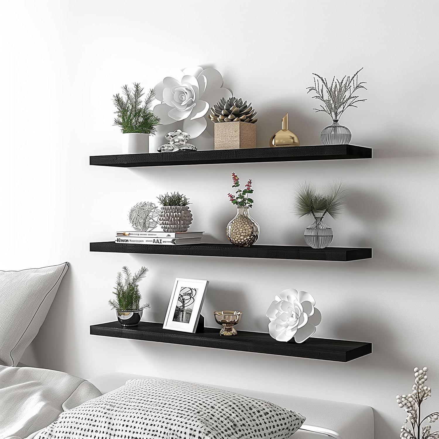 Wood Floating Shelves for Wall Decor, Rustic Wall Shelves for Bedroom Bathroom Kitchen Living Room, Set of 4 Black 36 Inch