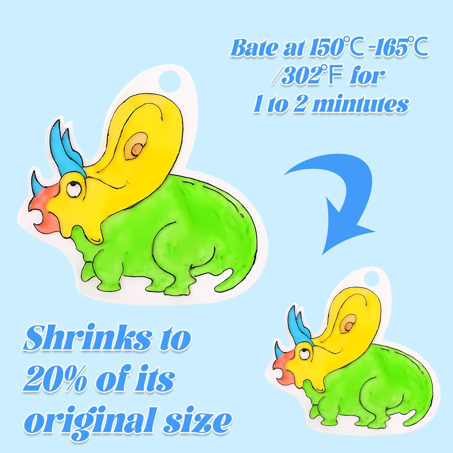 - Simple to Use: Crafting with our shrink paper kit is a breeze, even for young crafters. Just draw or trace your design onto the shrink film, cut it out with scissors, punch a hole if needed, then bake (320℉~356℉ Approx.2-3Minutes) ! The shrink film will shrink to 20% of its original size and thicken into a durable plastic material. Please note that this shrink plastic is not suitable for inkjet or laser printing.