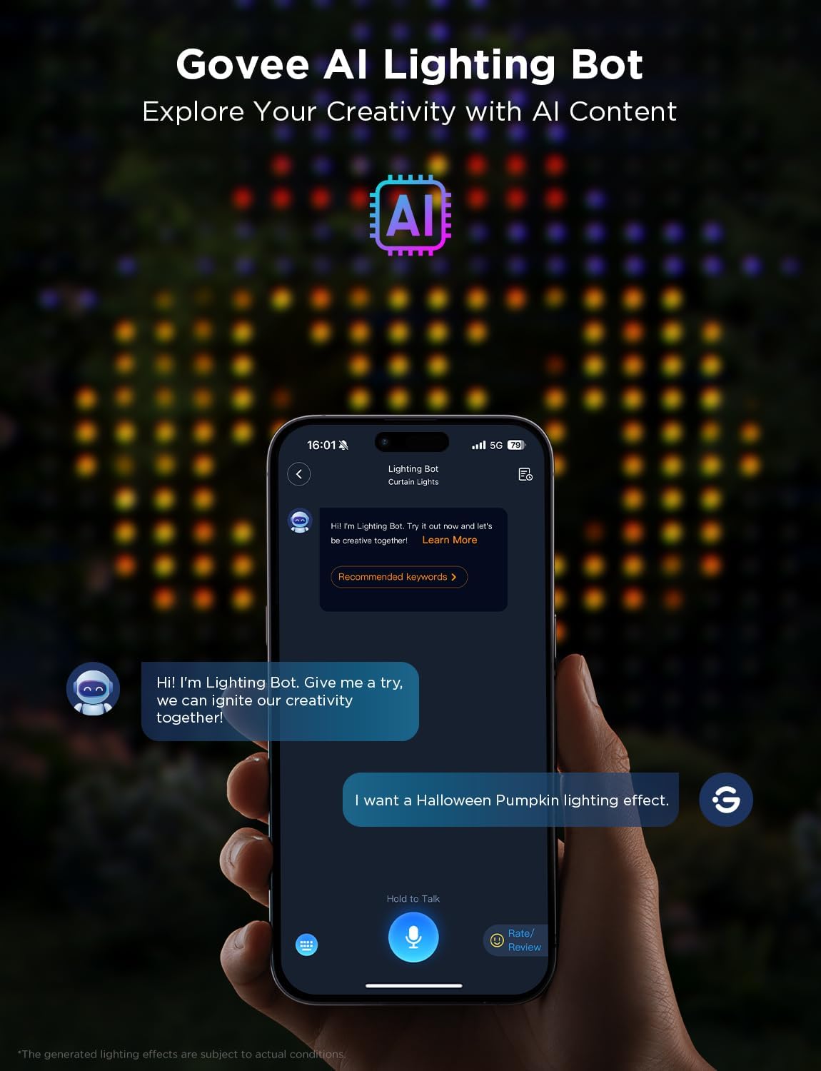 - AI Light Show: New AI-generated lighting effects instantly by chatting with the Govee AI Lighting Bot or uploading images. Embrace a world of infinite creativity and scene creation based on any passion, hobby, topic, and time of year.